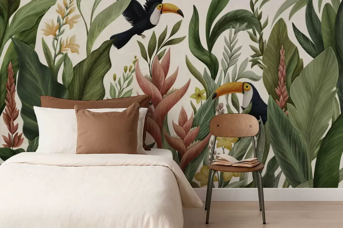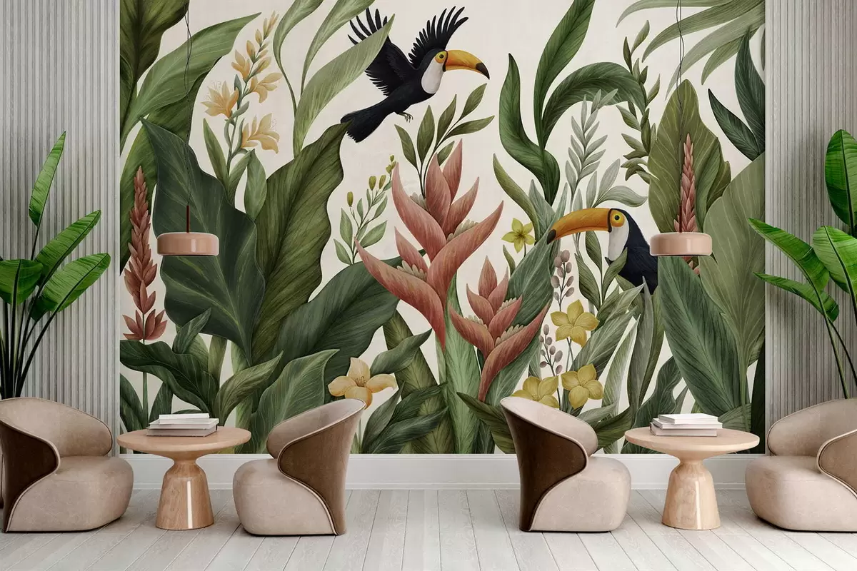 Τοιχογραφίες Τροπικό φύλλωμα και πουλιά με μεγάλα ράμφη σε σκούρο φόντο Nr. w05088v1