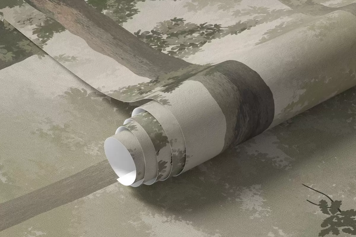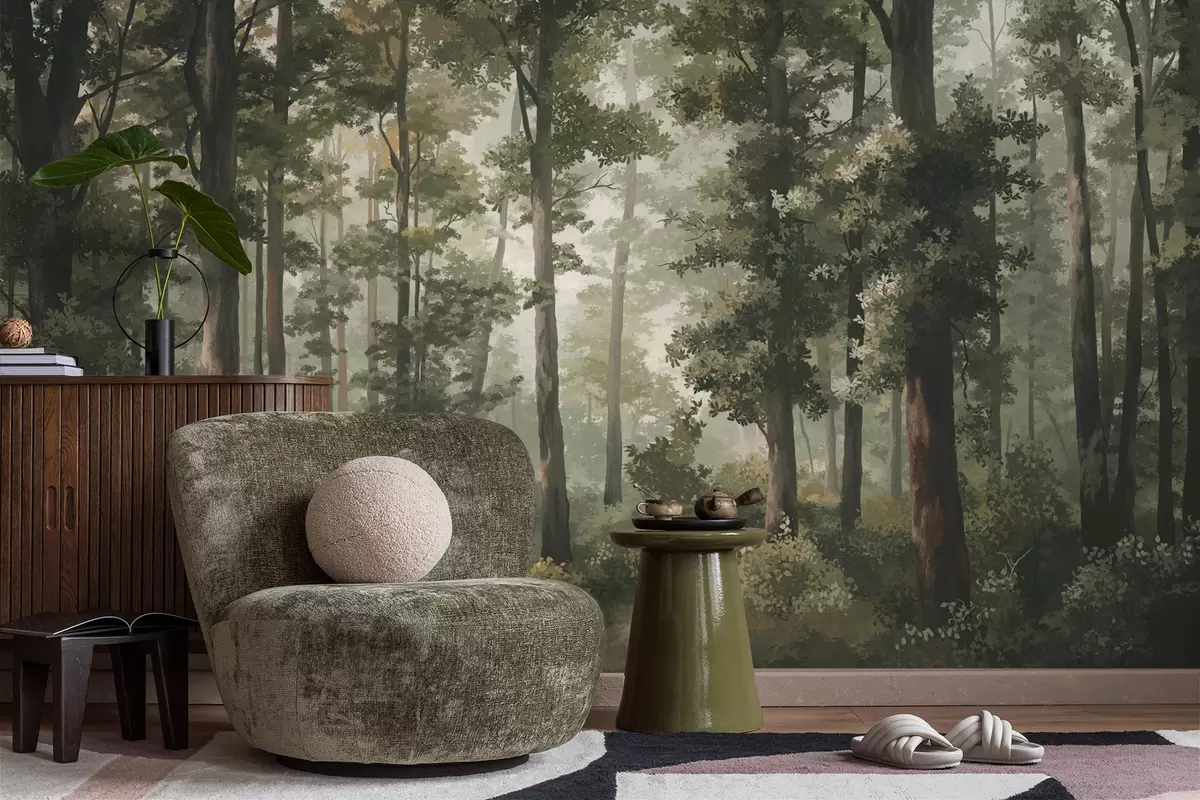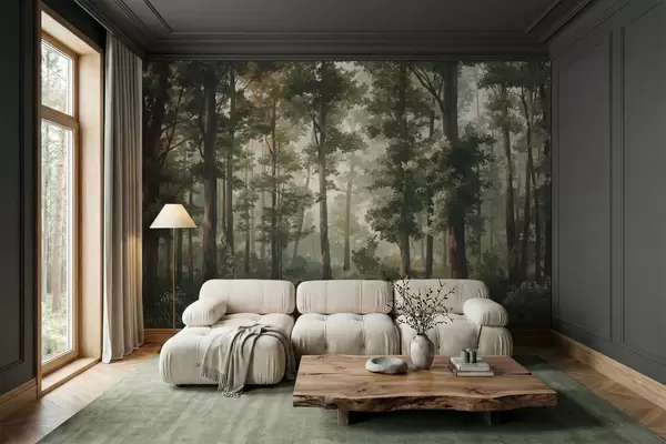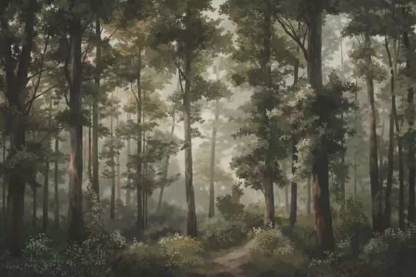 Τοιχογραφίες Εικονογράφηση δάσους με ομίχλη, ψηλά δέντρα και μονοπάτι Nr. w05089