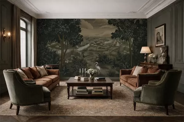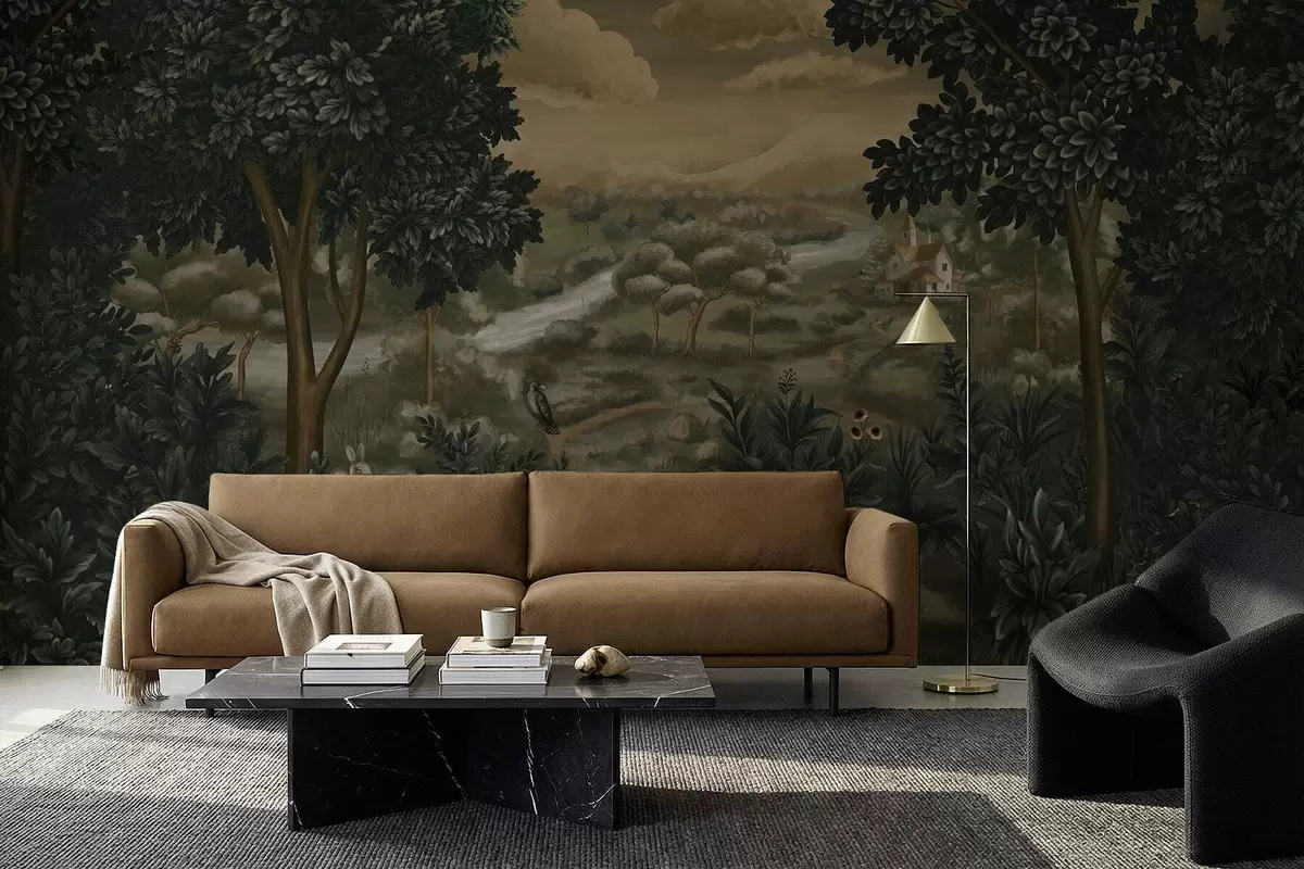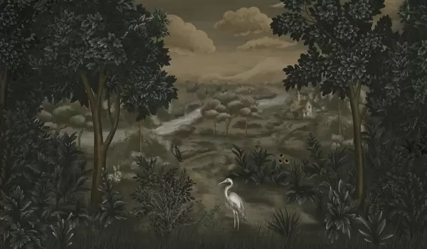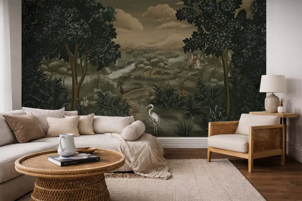 Τοιχογραφίες Φανταστικό τοπίο με ποτάμι, σπίτι και πουλιά ανάμεσα στα δέντρα Nr. w05090