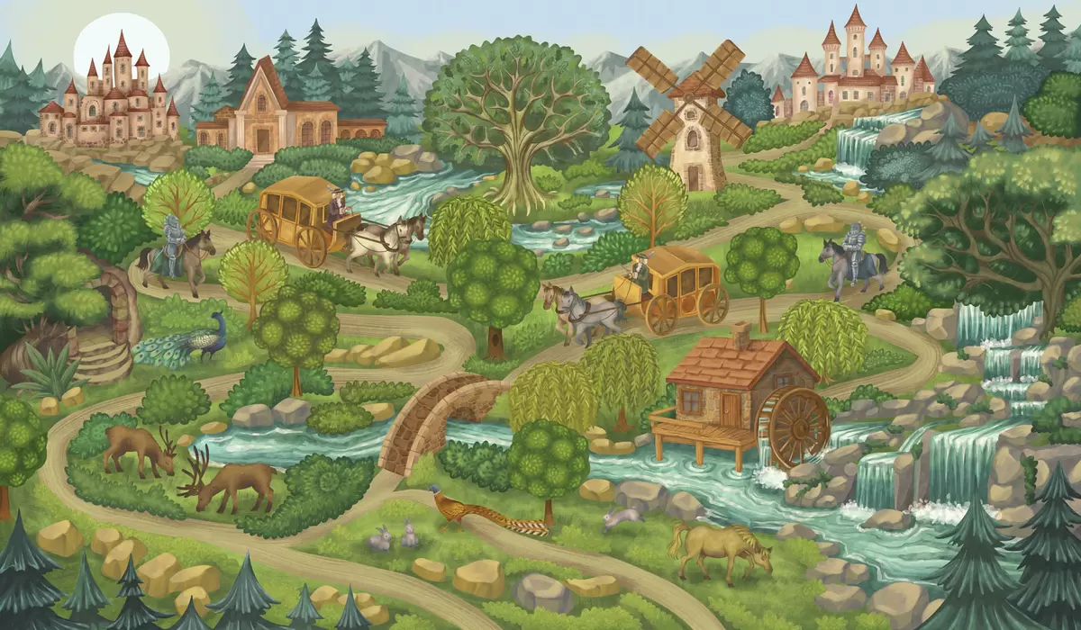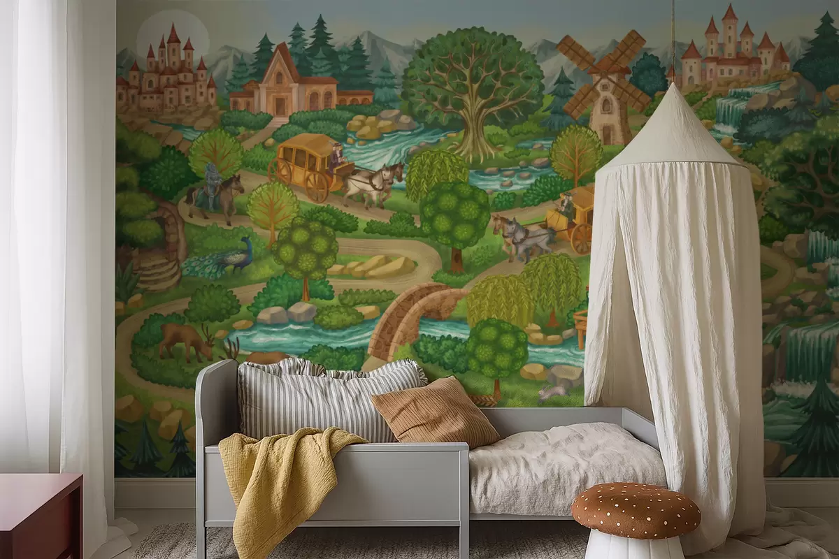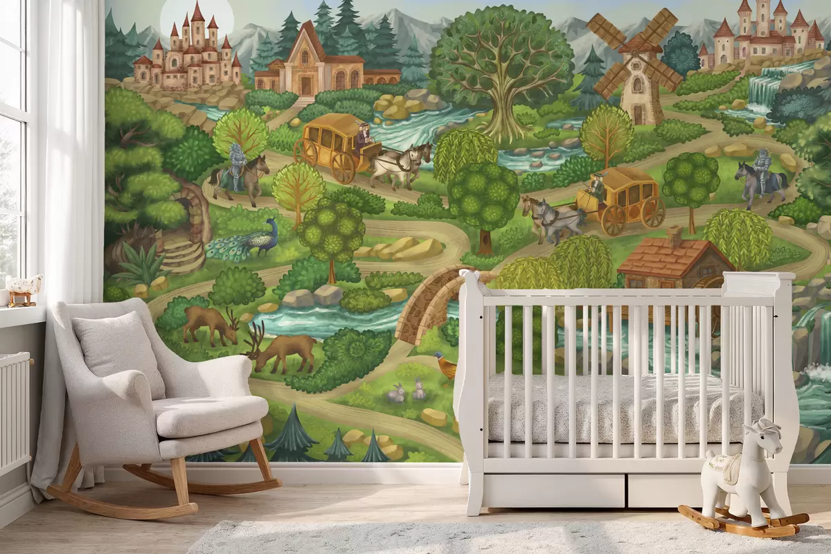 Τοιχογραφίες Παραμυθένια εικονογράφηση με κάστρα, δάσος, ποτάμια και ταξιδιώτες Nr. w05091v1