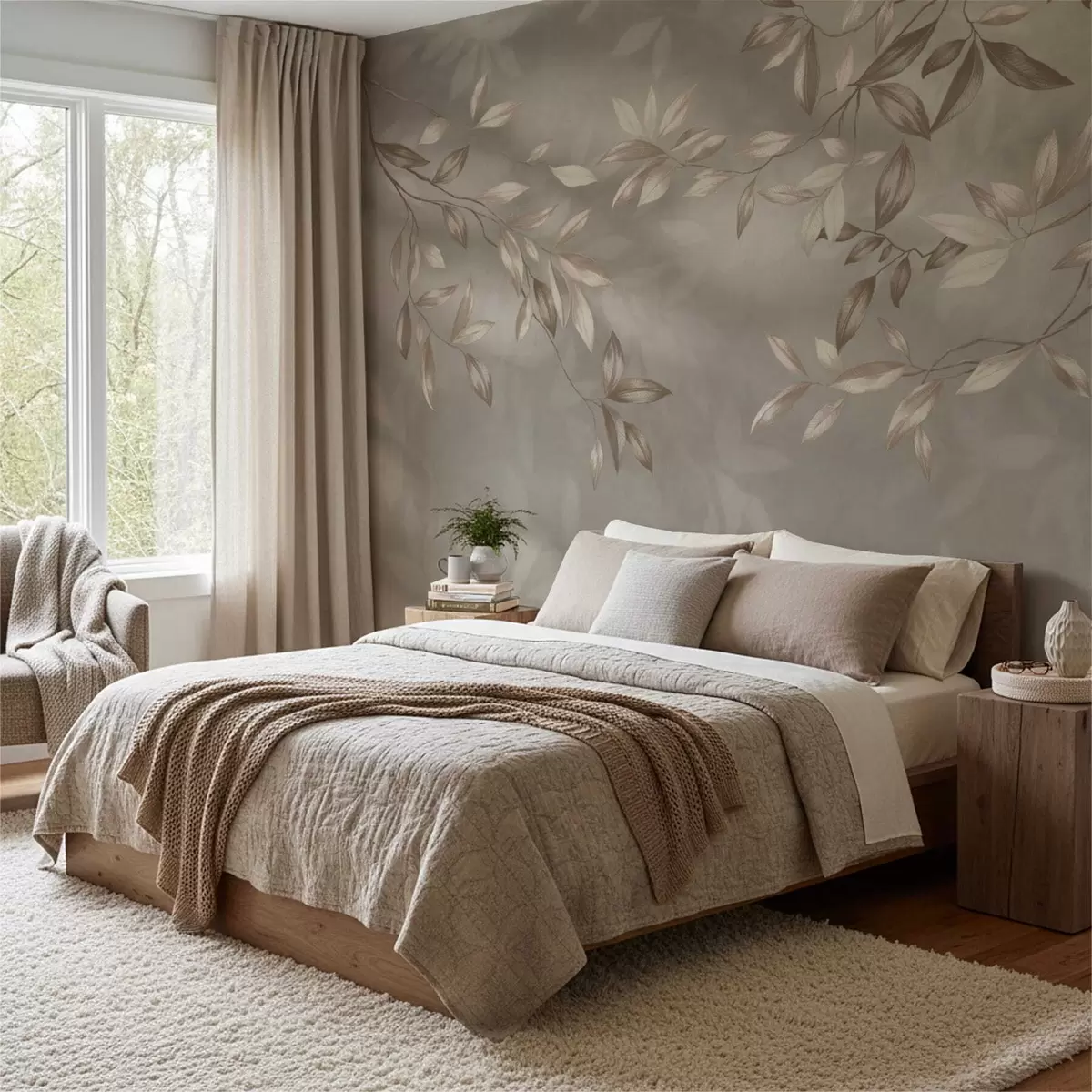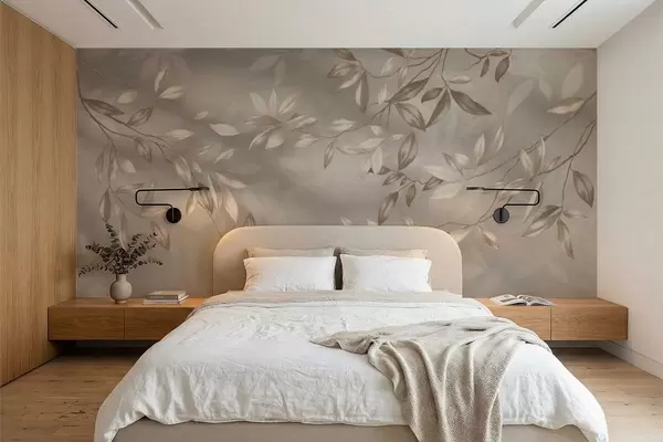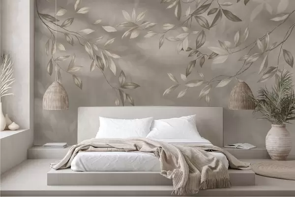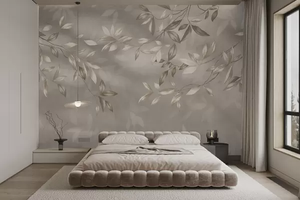 Τοιχογραφίες Κομψά φυλλώδη κλαδιά σε μπεζ αποχρώσεις σε ανοιχτόχρωμο φόντο Nr. w05113