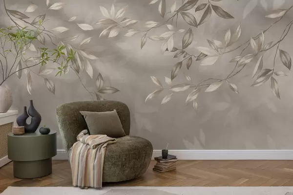 Τοιχογραφίες Κομψά φυλλώδη κλαδιά σε μπεζ αποχρώσεις σε ανοιχτόχρωμο φόντο Nr. w05113