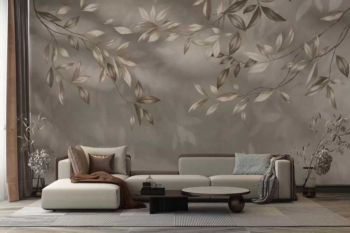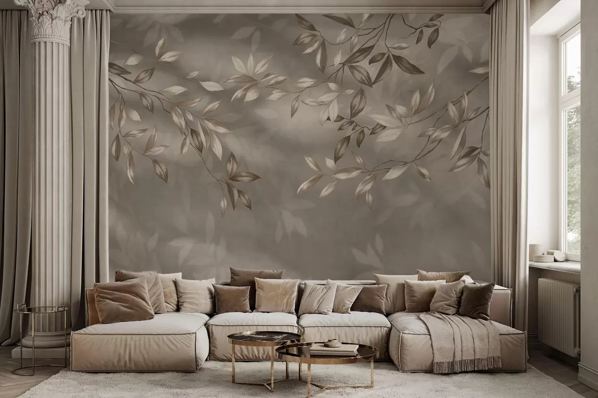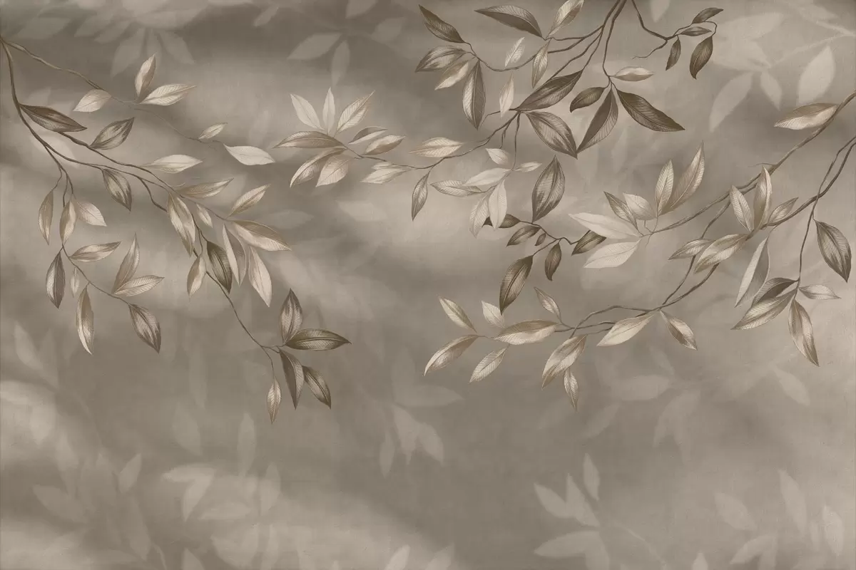 Τοιχογραφίες Λεπτά φυλλώδη κλαδιά σε μπεζ αποχρώσεις σε ανοιχτόχρωμο φόντο Nr. w05113v2