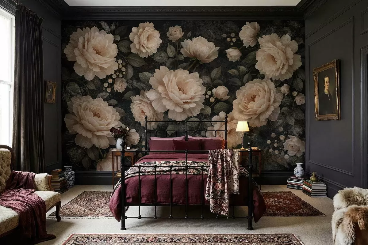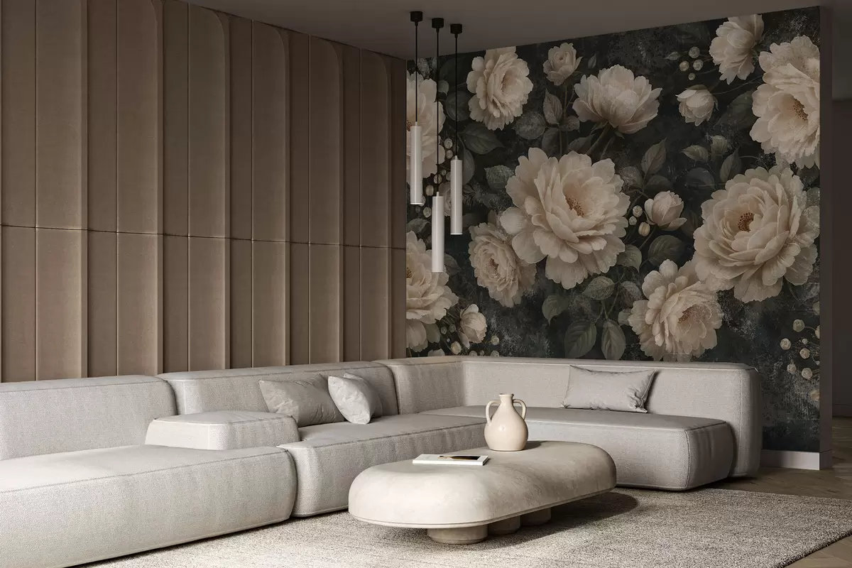 Τοιχογραφίες Ογκώδη λουλούδια σε μπεζ χρώματα σε σκούρο φόντο Nr. w05114