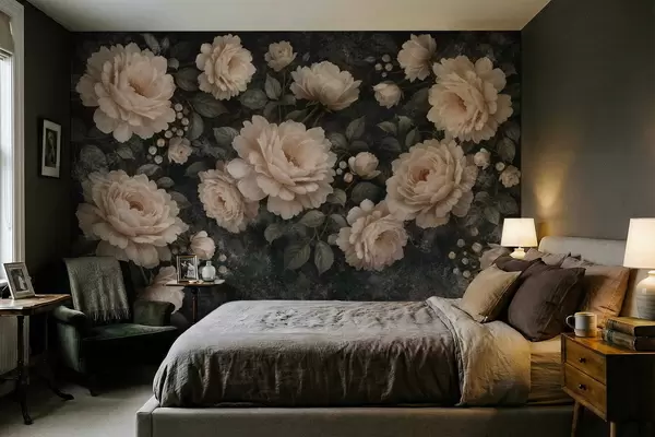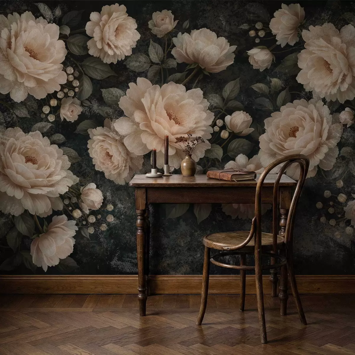 Τοιχογραφίες Ογκώδη λουλούδια σε μπεζ χρώματα σε σκούρο φόντο Nr. w05114