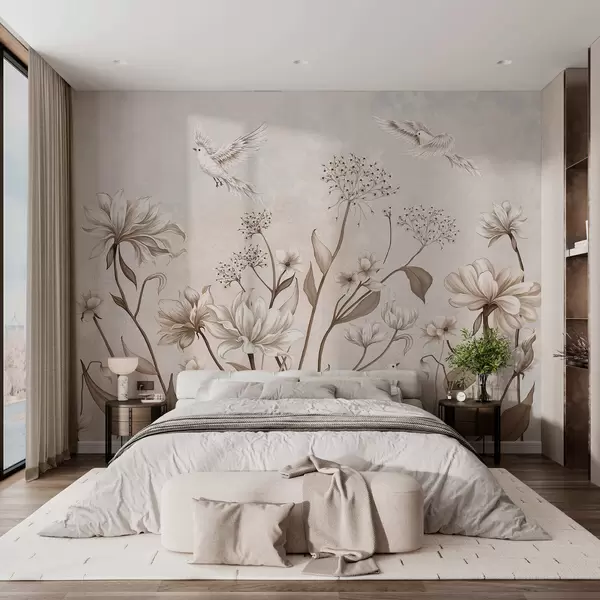Τοιχογραφίες Απαλά λουλούδια και πουλιά σε απαλό φόντο Nr. w05118
