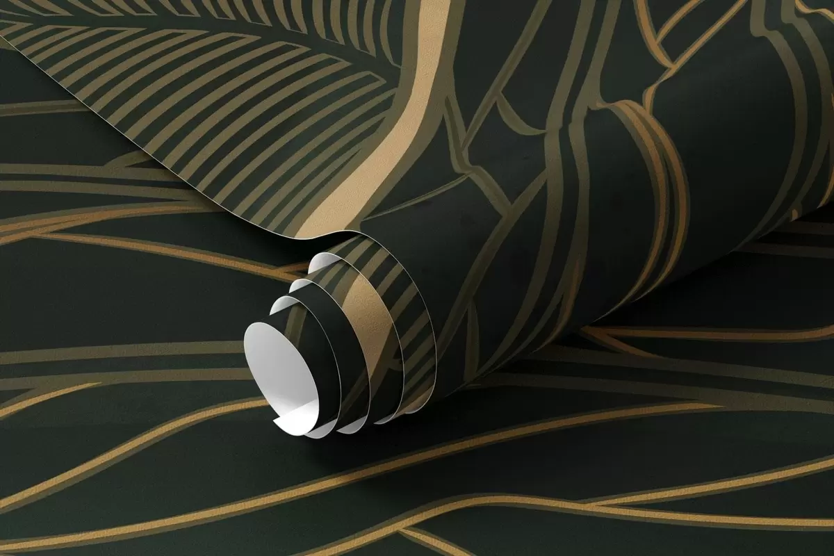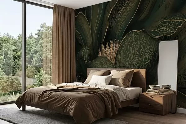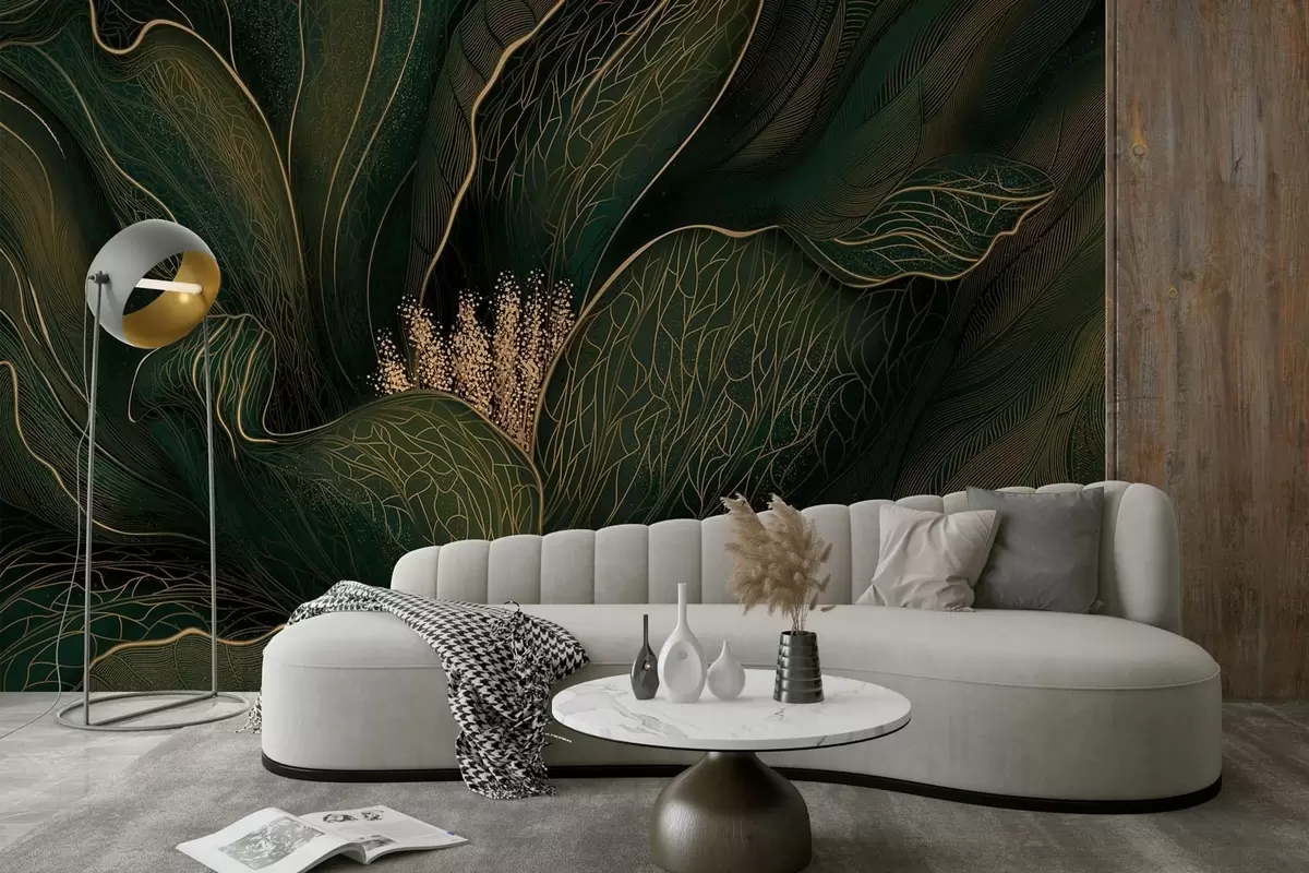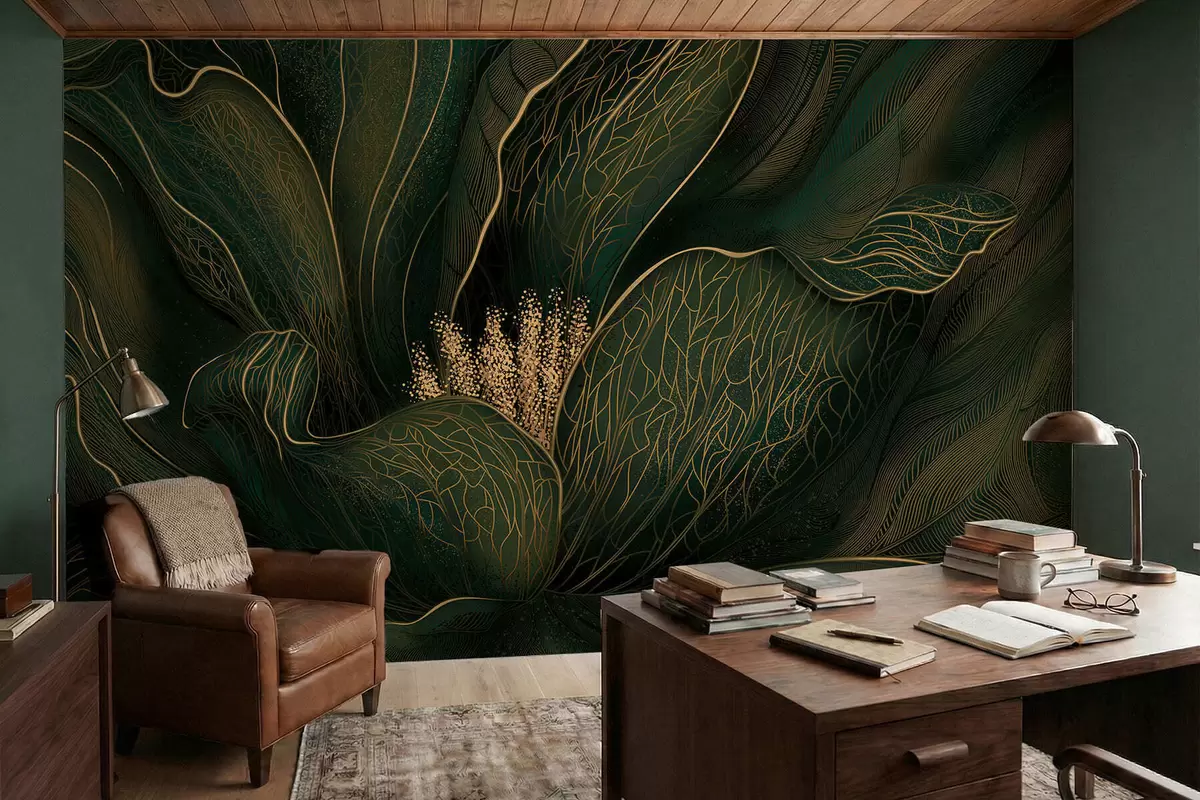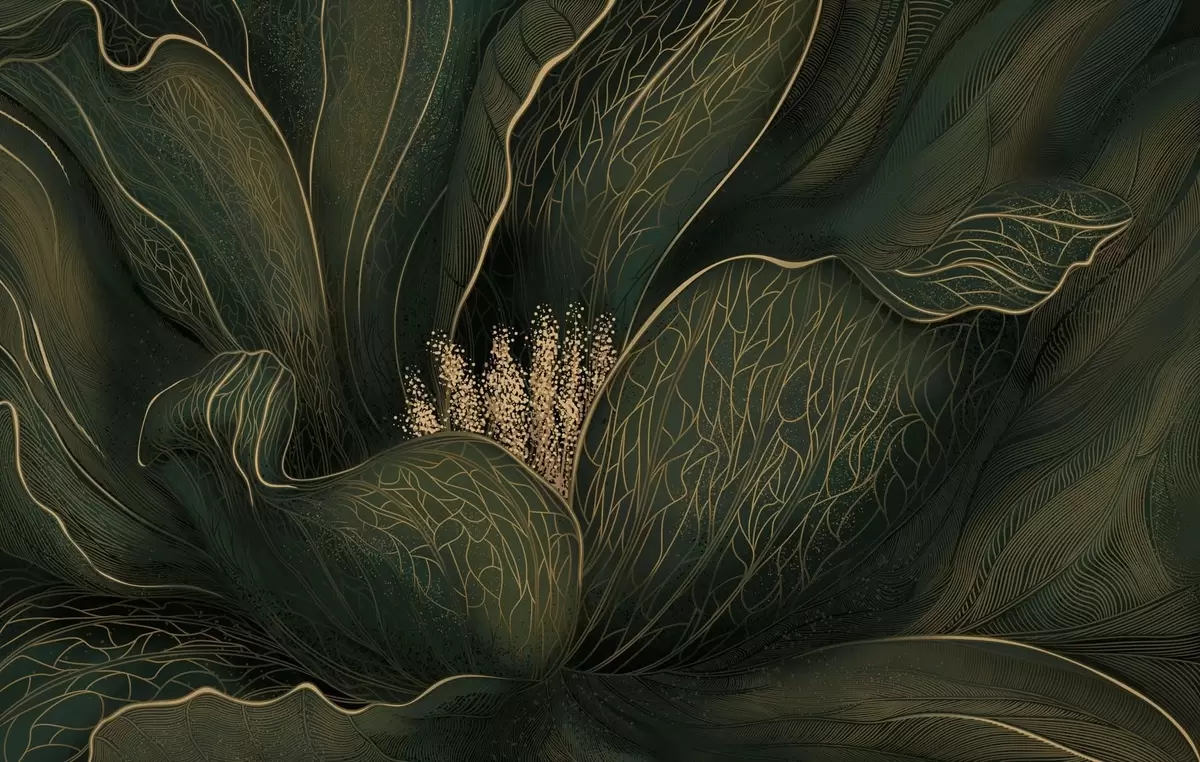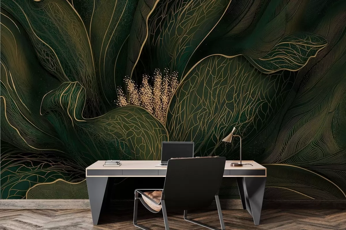 Τοιχογραφίες Σκούρο πράσινο αφηρημένο λουλούδι με λεπτομέρειες από λεπτές γραμμές Nr. w05119v1
