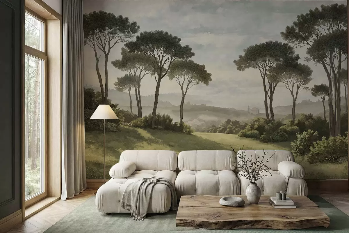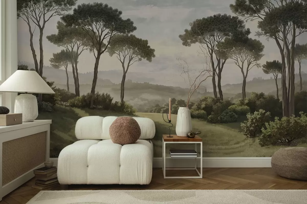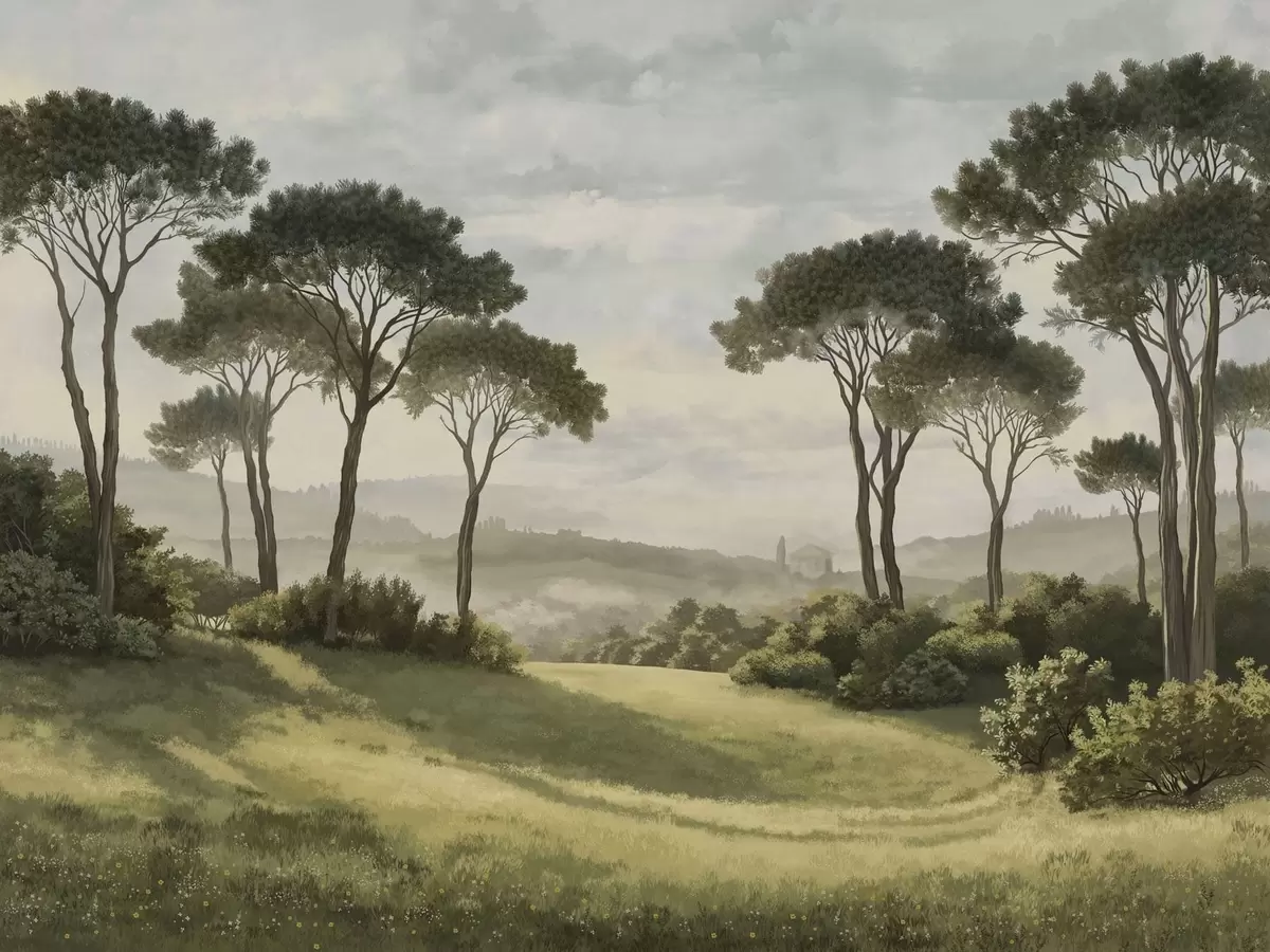 Τοιχογραφίες Τοπίο με δέντρα, λιβάδι και ομίχλη στο βάθος Nr. w05122v1