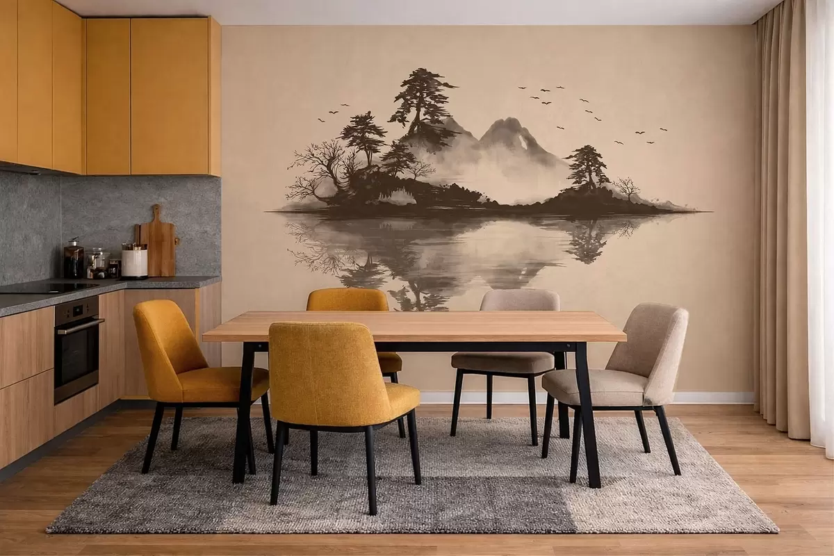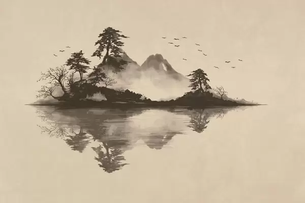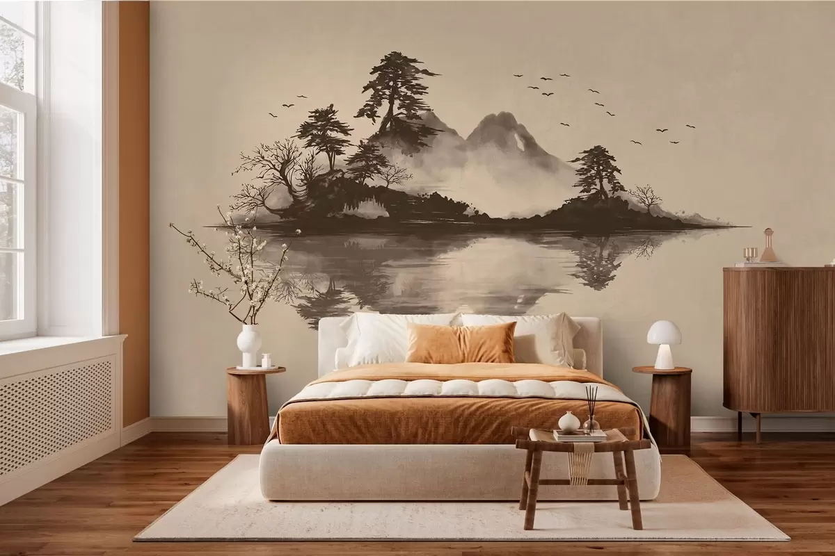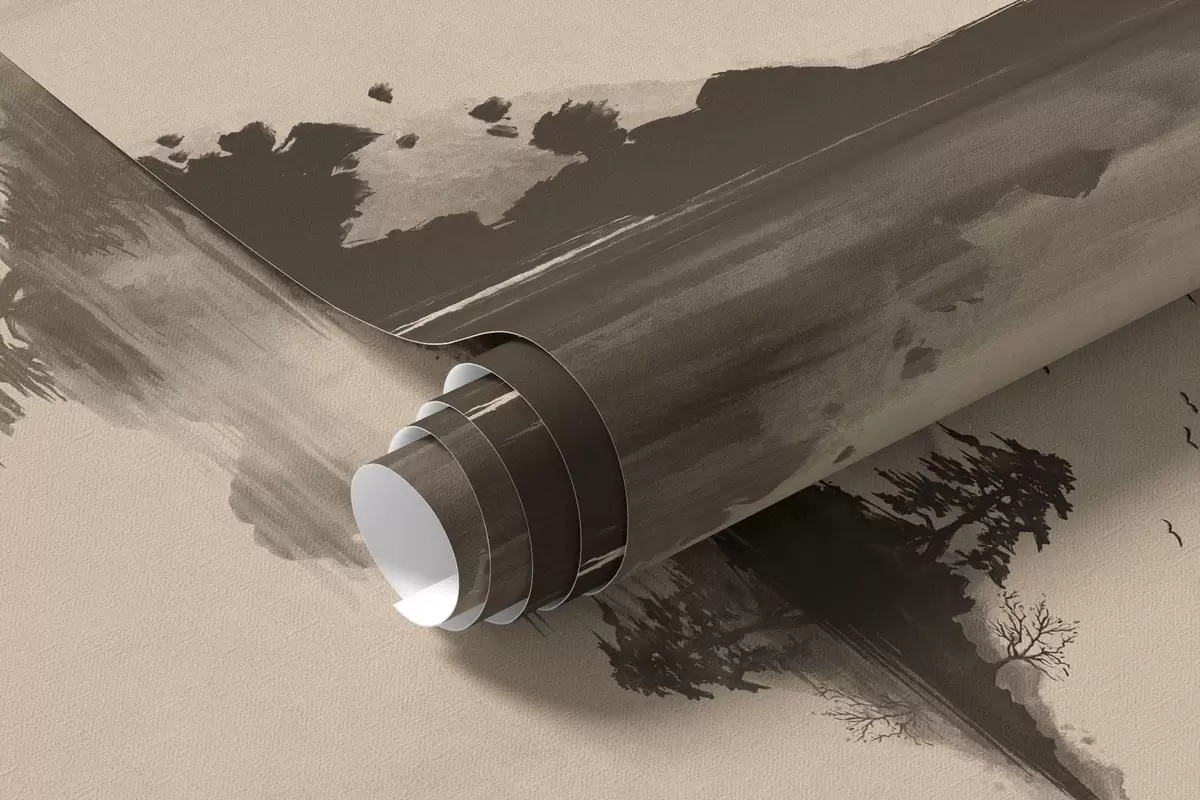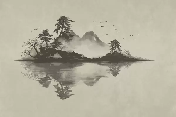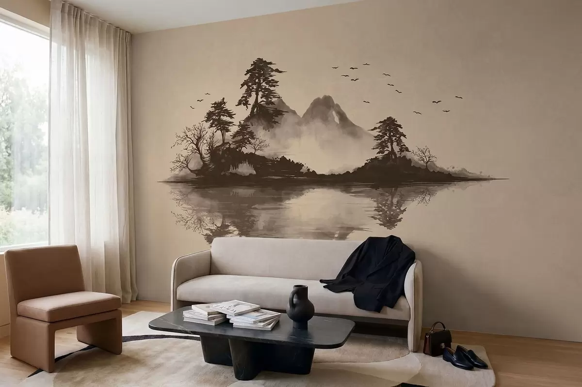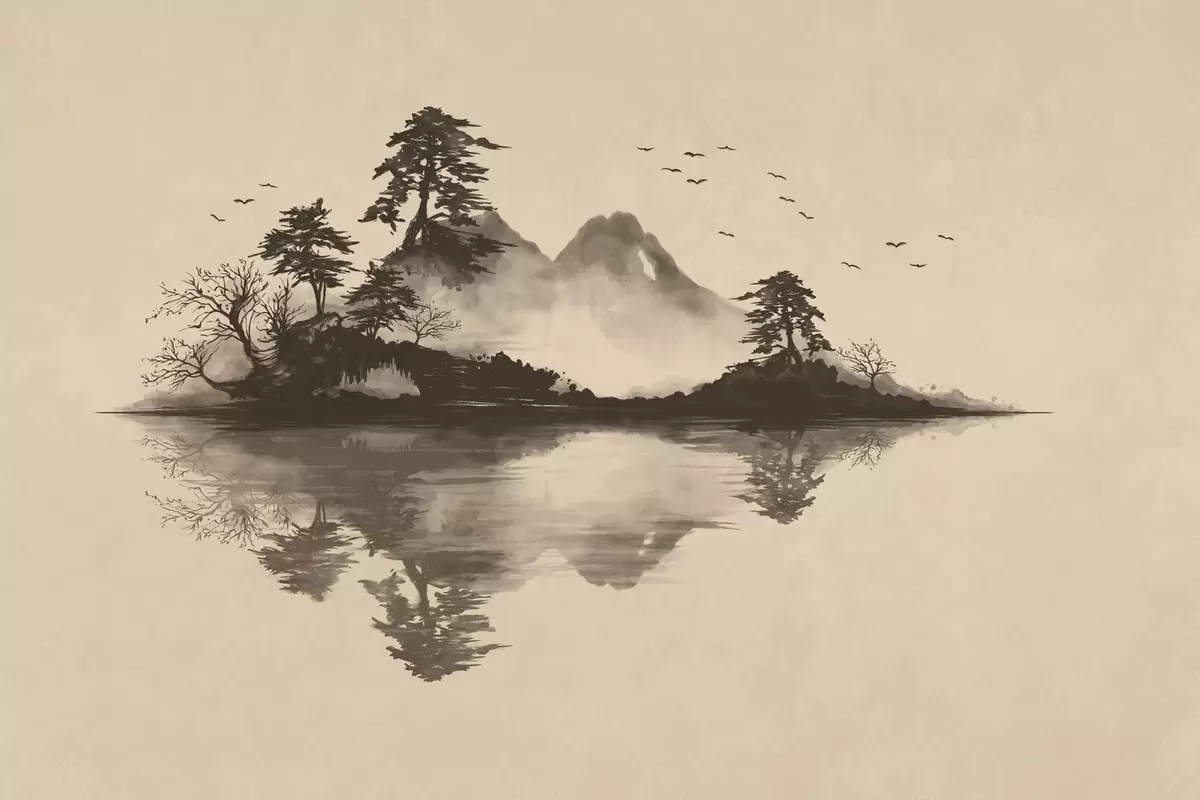Τοιχογραφίες Τοπίο βουνού σε στυλ σούμι-ε με πεύκα και αντανάκλαση Nr. w05124