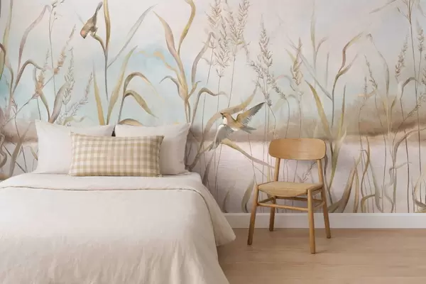 Τοιχογραφίες Εικονογράφηση με καλάμια και πουλιά δίπλα στο νερό σε απαλούς τόνους Nr. w05125