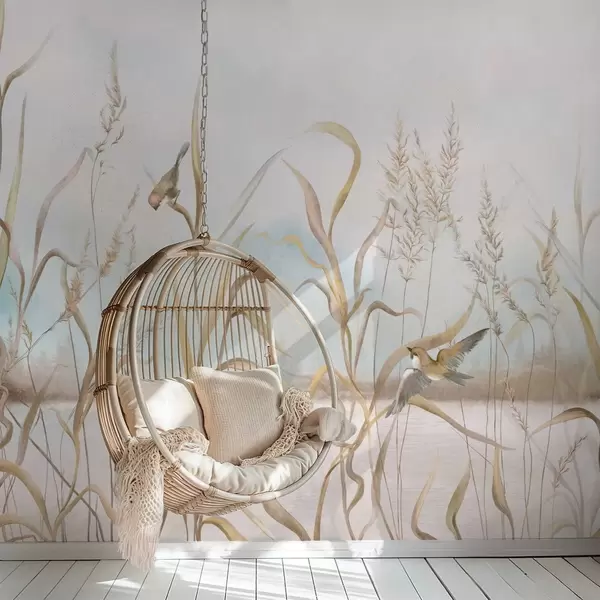 Τοιχογραφίες Εικονογράφηση με καλάμια και πουλιά δίπλα στο νερό σε απαλούς τόνους Nr. w05125
