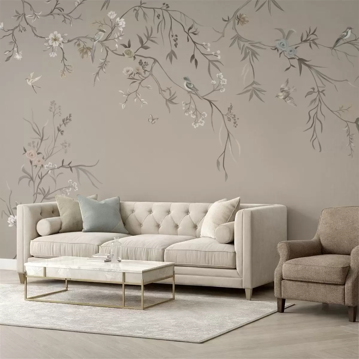 Τοιχογραφίες Λουλουδάτο μοτίβο με πουλιά σε ουδέτερο φόντο Nr. w05127v3