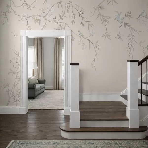 Τοιχογραφίες Λουλουδάτα κλαδιά με πουλιά σε ανοιχτόχρωμο φόντο Nr. w05127v7
