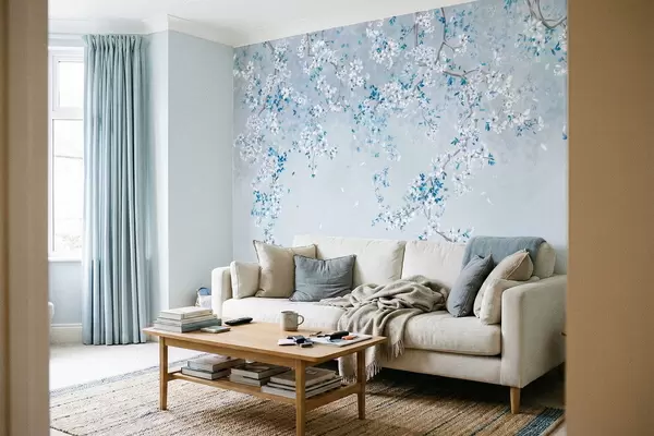 Τοιχογραφίες Κλαδιά με λευκά και μπλε άνθη σε δροσερό φόντο Nr. w05129v2