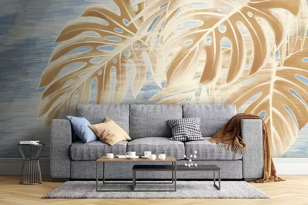 Τοιχογραφίες Φύλλα σε ανοιχτούς αμμώδεις τόνους σε μπλε φόντο Nr. w05130v1