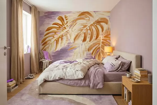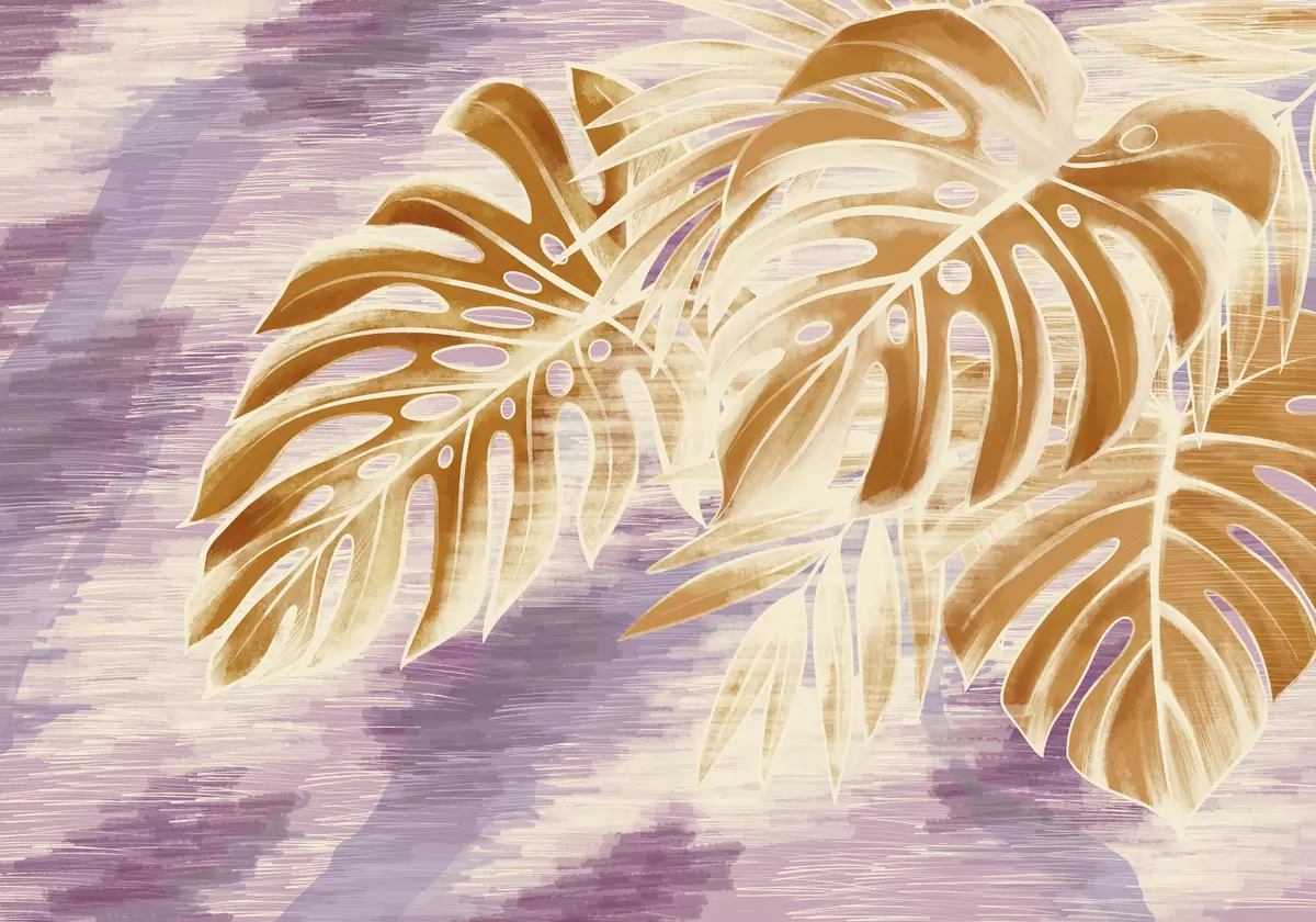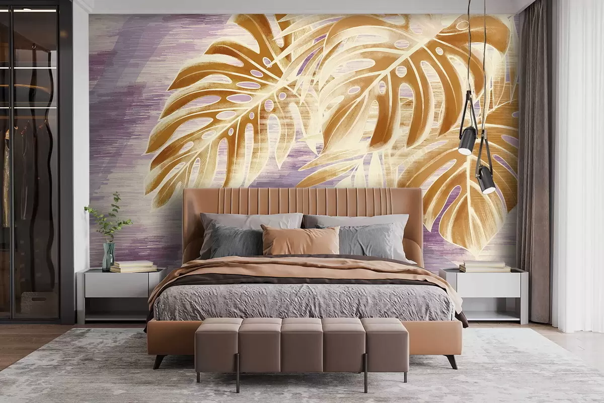 Τοιχογραφίες Φύλλα σε ζεστούς πορτοκαλί τόνους σε μοβ φόντο Nr. w05130v2