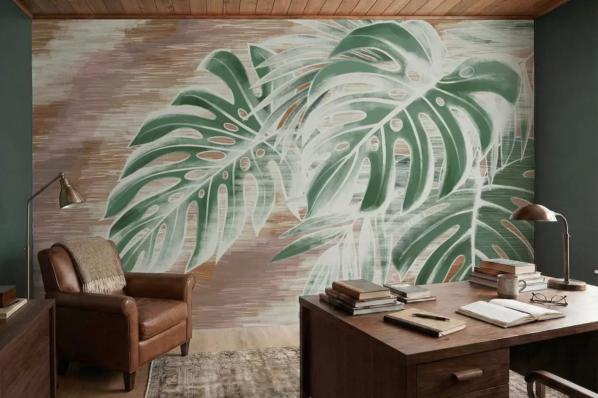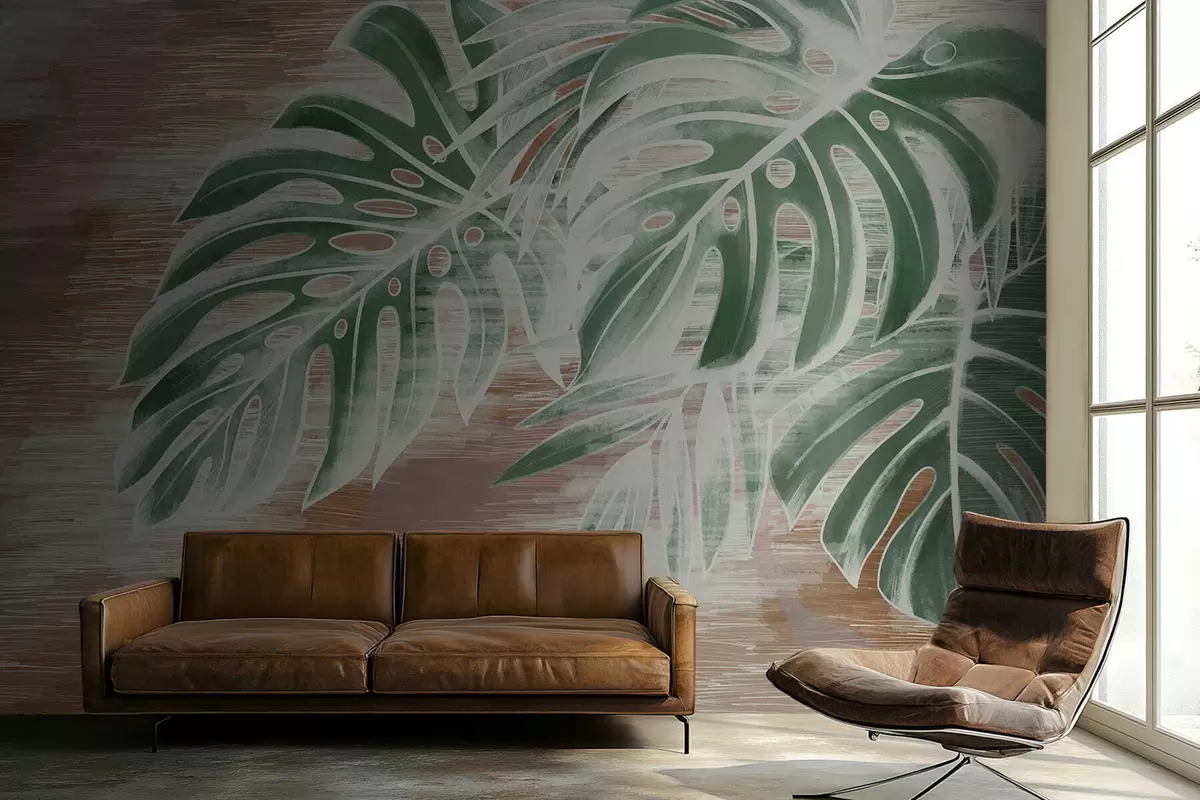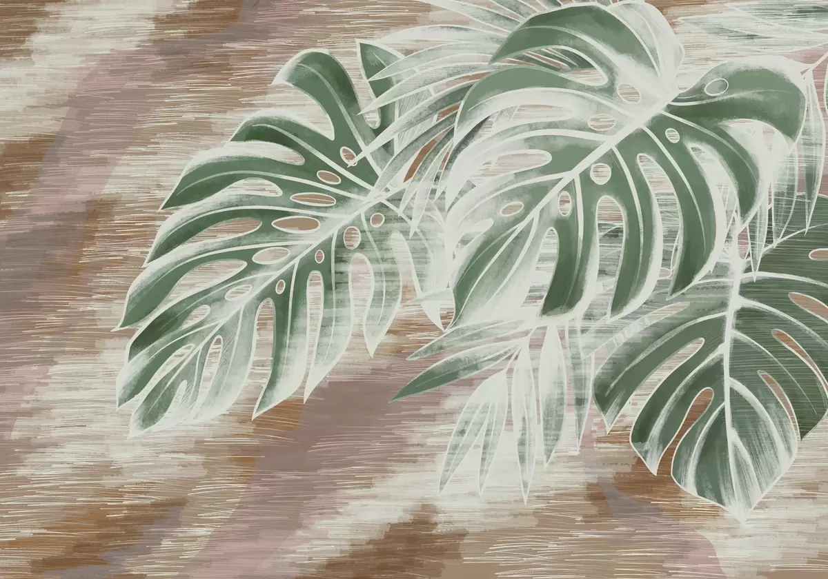 Τοιχογραφίες Πράσινα φύλλα σε μια ζεστή, αφηρημένη βάση με υφή Nr. w05130v3