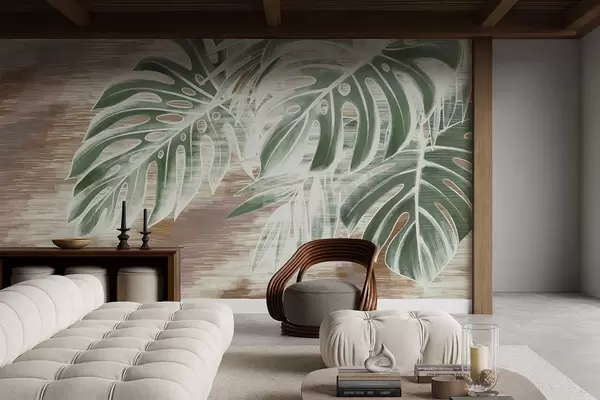 Τοιχογραφίες Πράσινα φύλλα σε μια ζεστή, αφηρημένη βάση με υφή Nr. w05130v3