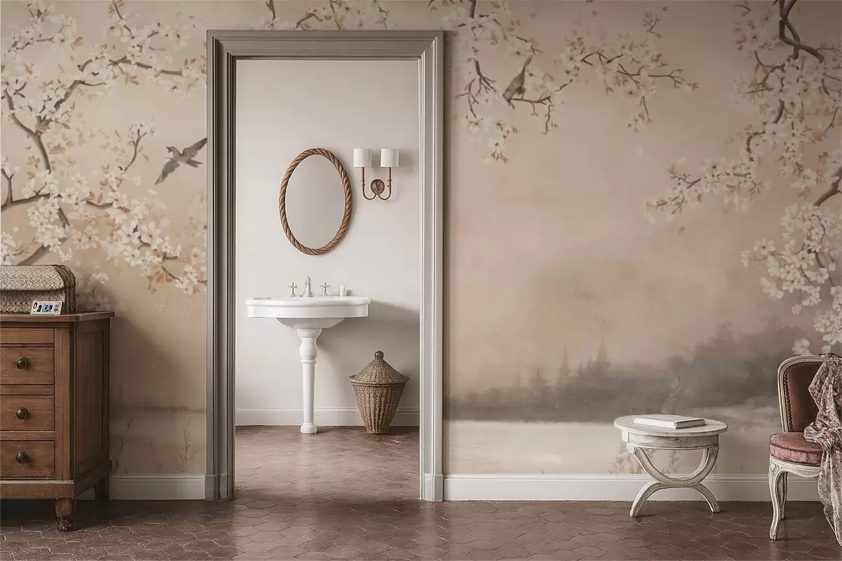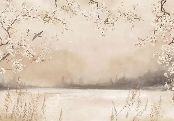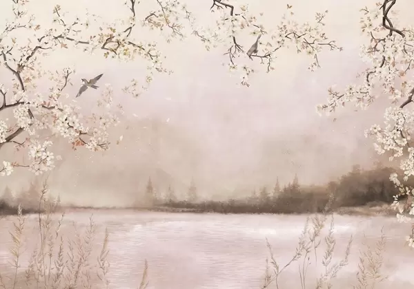 Τοιχογραφίες Λεπτά ανθισμένα κλαδιά δίπλα στη λίμνη με πουλιά σε ελαφριά ομίχλη Nr. w05155