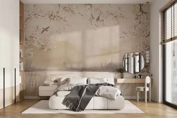 Τοιχογραφίες Λεπτά ανθισμένα κλαδιά δίπλα στη λίμνη με πουλιά σε ελαφριά ομίχλη Nr. w05155