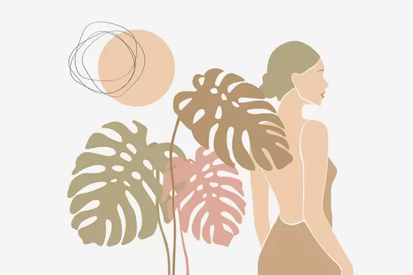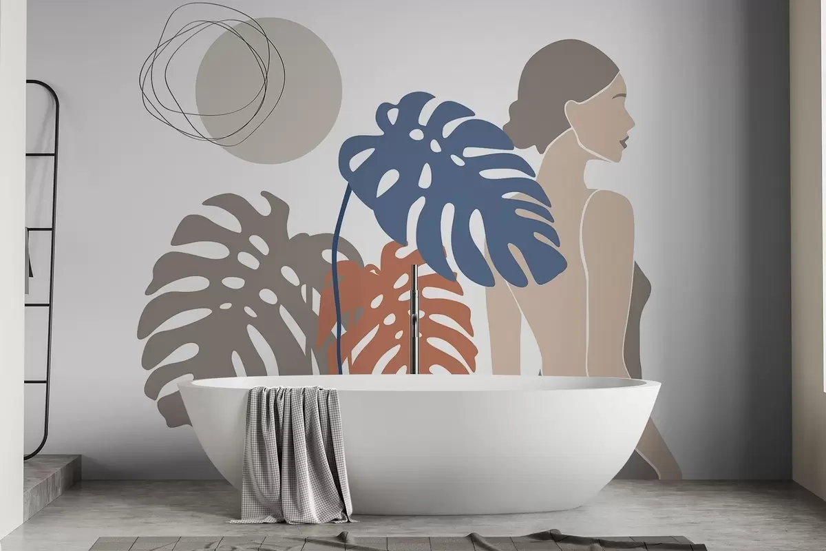 Τοιχογραφίες Σιλουέτα γυναίκας κοντά σε τροπικά φύλλα Nr. w05192