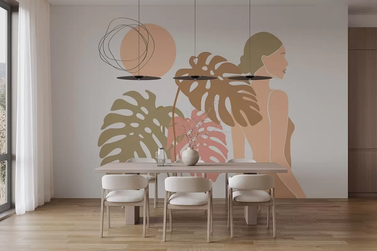 Τοιχογραφίες Σιλουέτα γυναίκας κοντά σε τροπικά φύλλα Nr. w05192v1