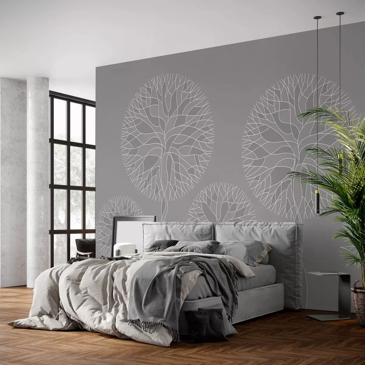 Τοιχογραφίες Φανταστικά γραμμικά δέντρα με πλούσιες κορώνες σε μεσαίες αποχρώσεις του γκρι Nr. w05213v5