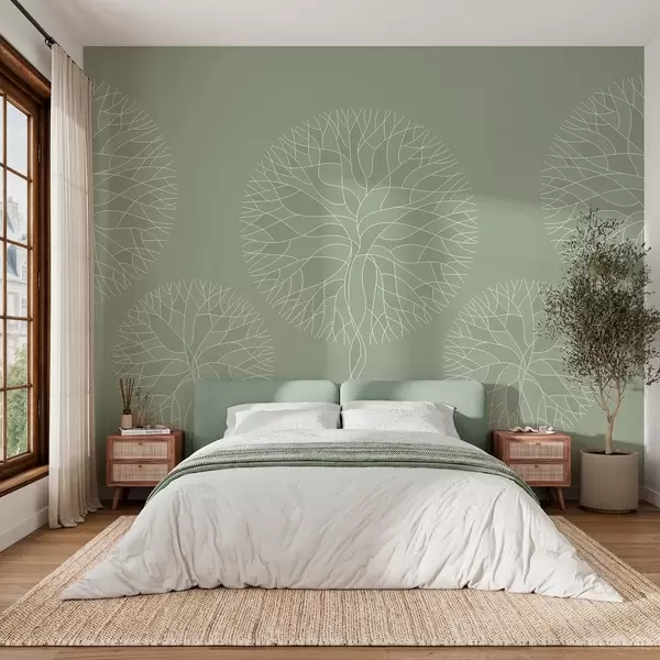 Τοιχογραφίες Φανταστικά γραμμικά δέντρα με πλούσιες κορώνες σε ανοιχτούς πράσινους τόνους Nr. w05213v6