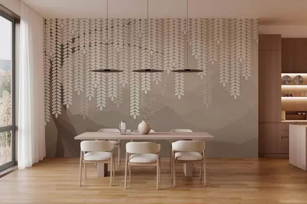 Τοιχογραφίες Στυλιζαρισμένη ιτιά με κρεμαστά φύλλα σε φόντο μινιμαλιστικών βουνών σε αποχρώσεις του καφέ. Nr. w05232v2