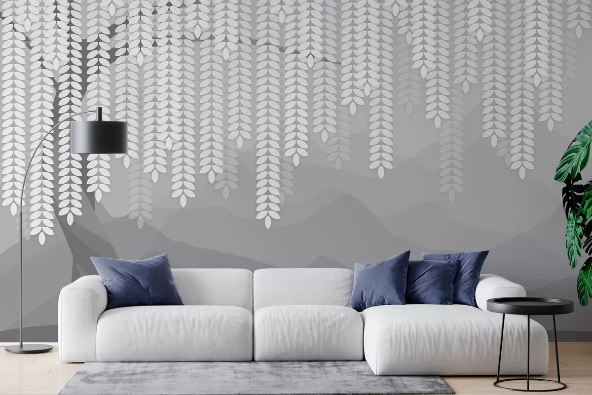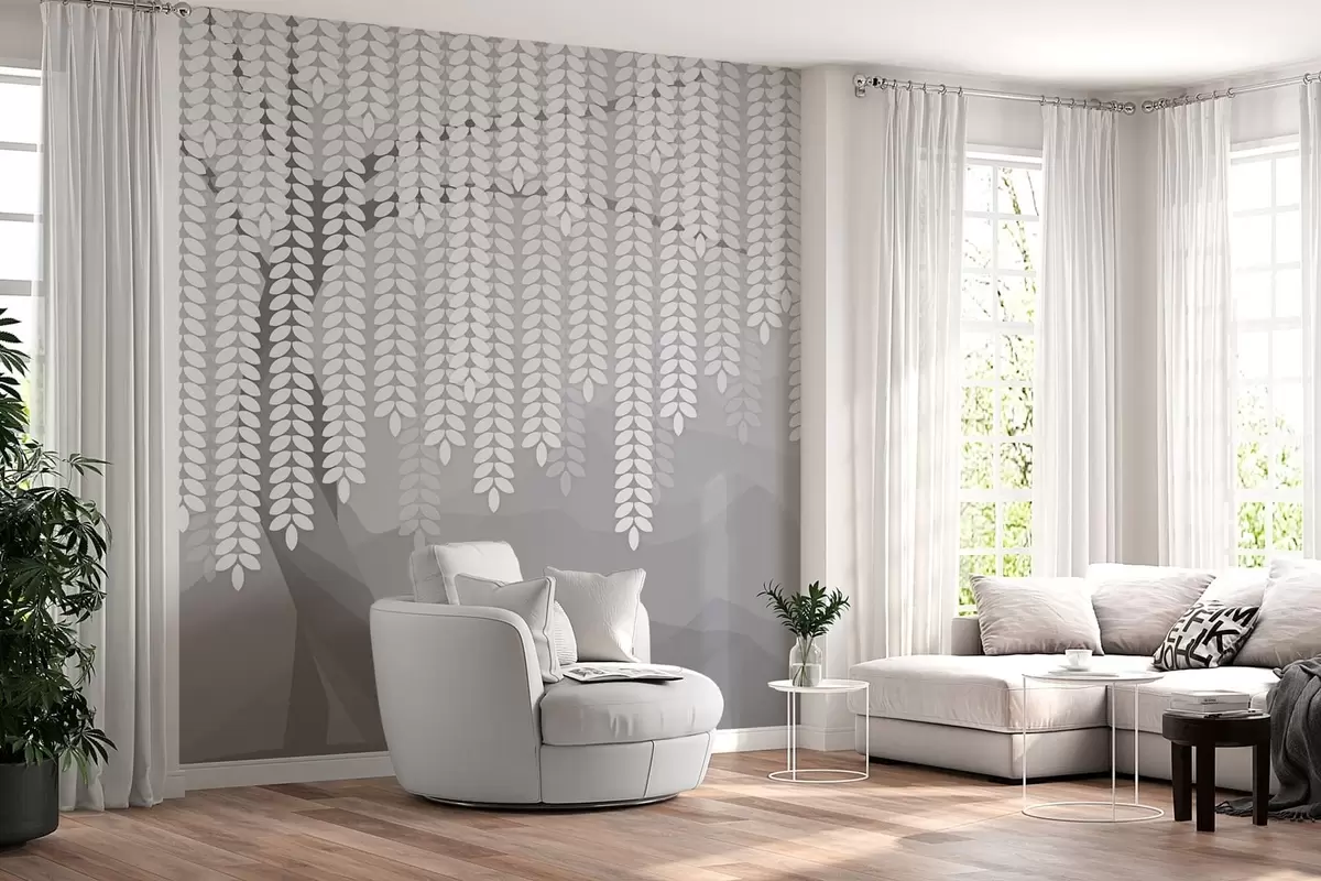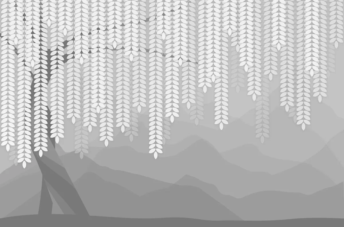 Τοιχογραφίες Στυλιζαρισμένη ιτιά με κρεμαστά φύλλα σε φόντο μινιμαλιστικών βουνών σε αποχρώσεις του γκρι. Nr. w05232v3
