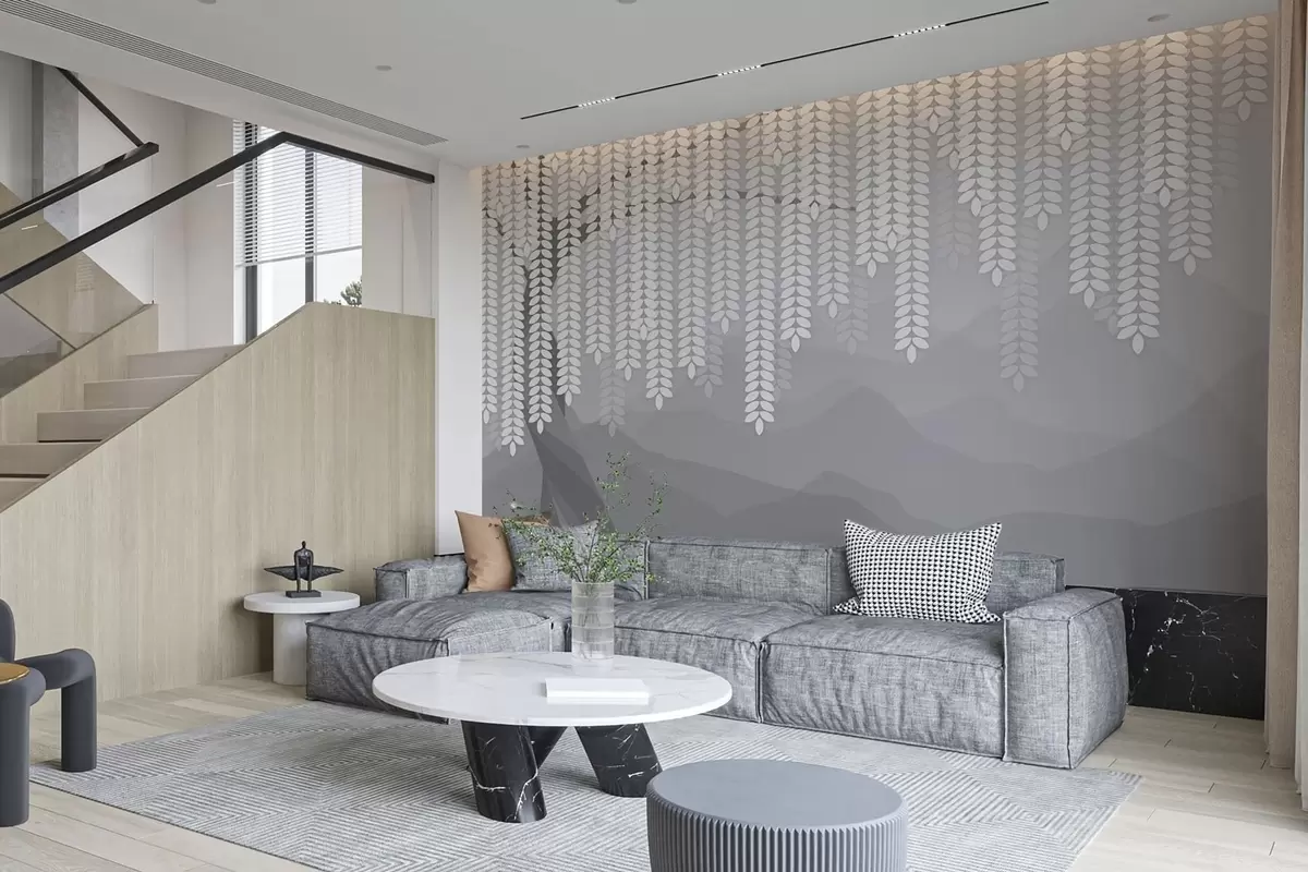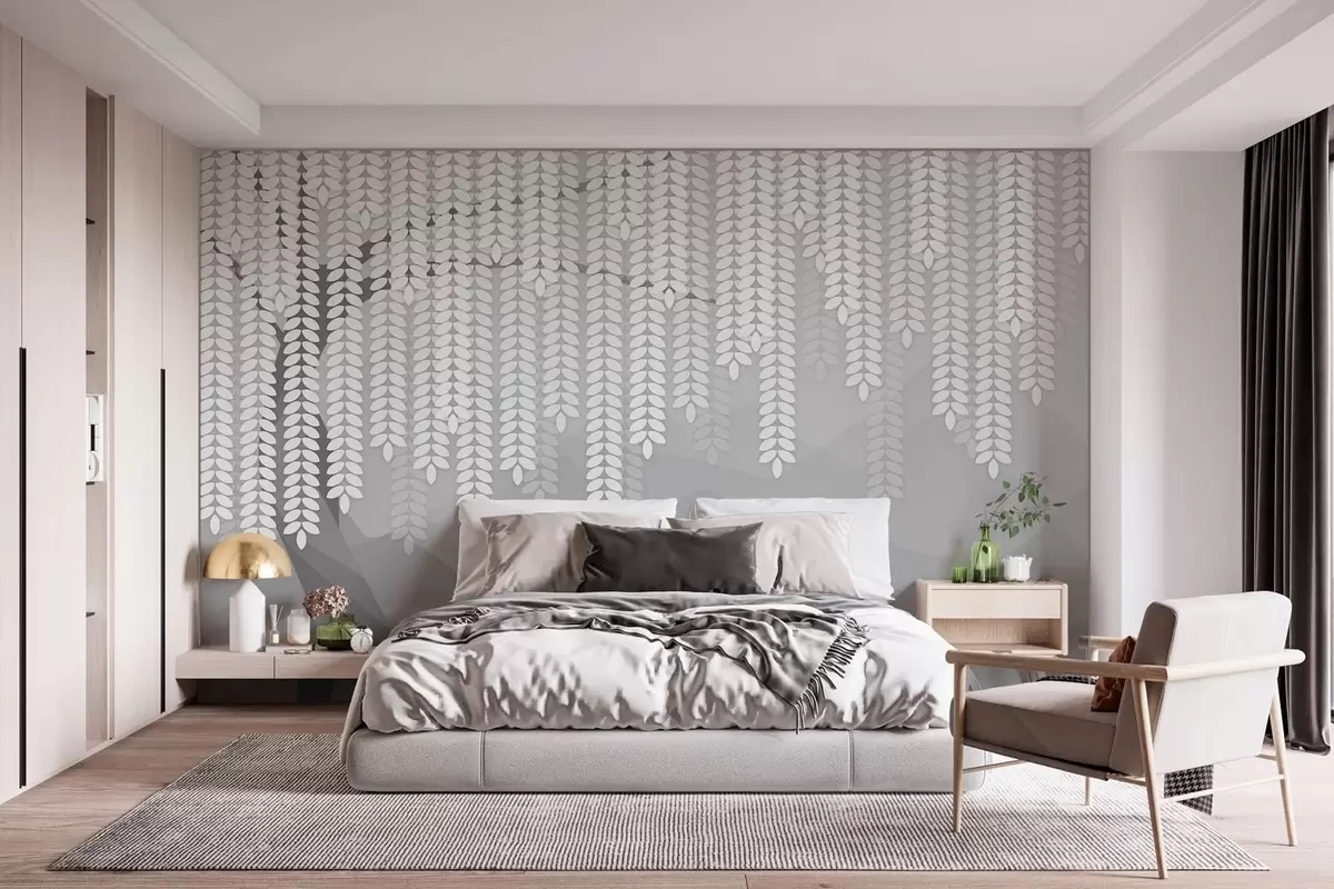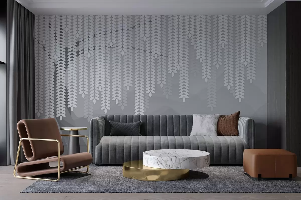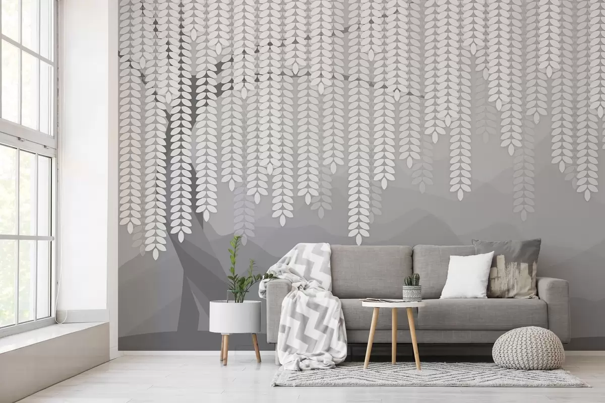 Τοιχογραφίες Στυλιζαρισμένη ιτιά με κρεμαστά φύλλα σε φόντο μινιμαλιστικών βουνών σε αποχρώσεις του γκρι. Nr. w05232v3
