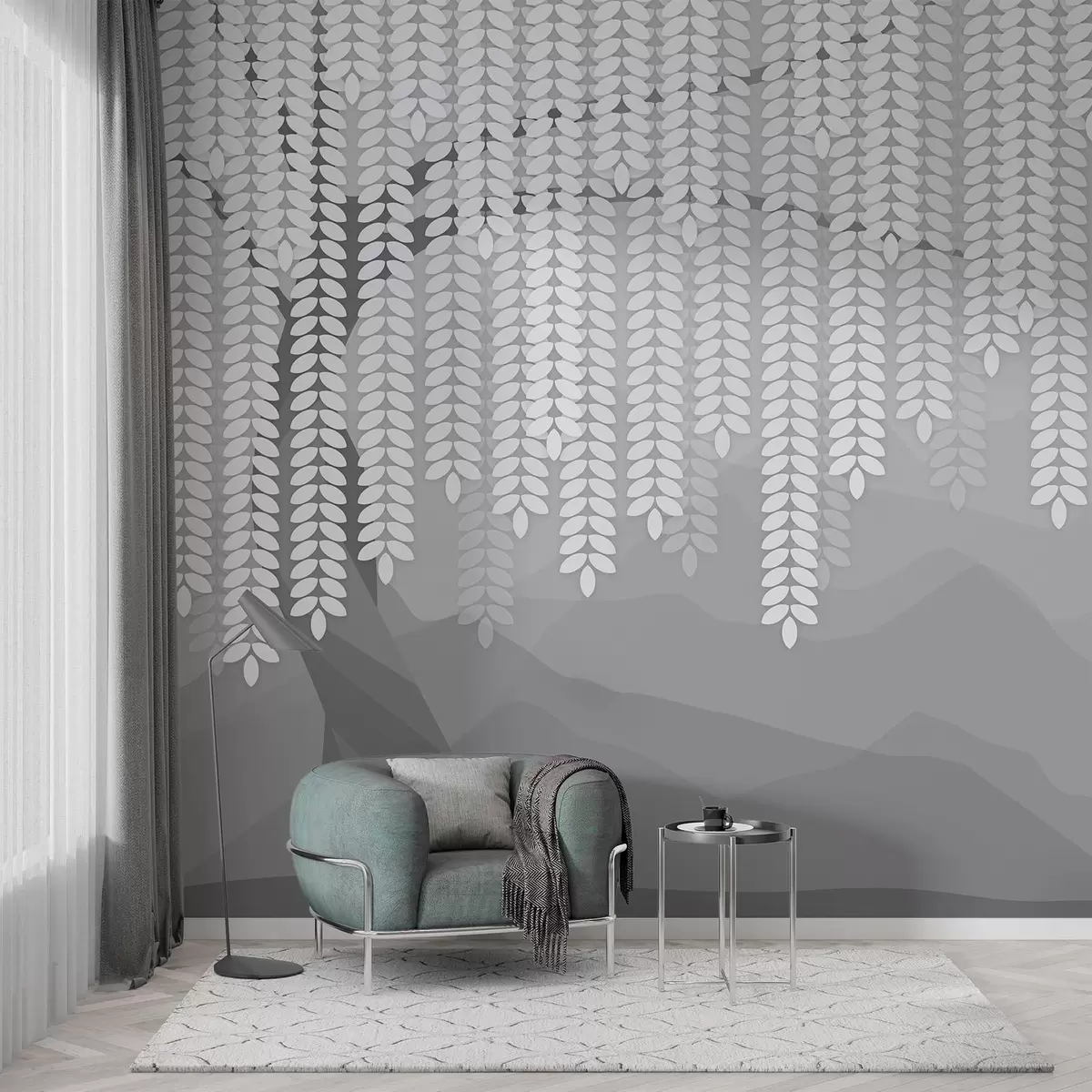 Τοιχογραφίες Στυλιζαρισμένη ιτιά με κρεμαστά φύλλα σε φόντο μινιμαλιστικών βουνών σε αποχρώσεις του γκρι. Nr. w05232v3