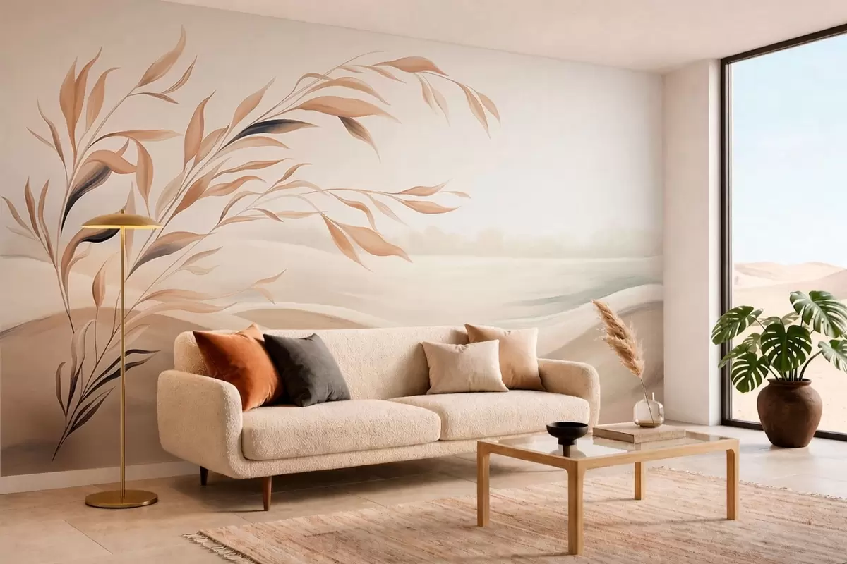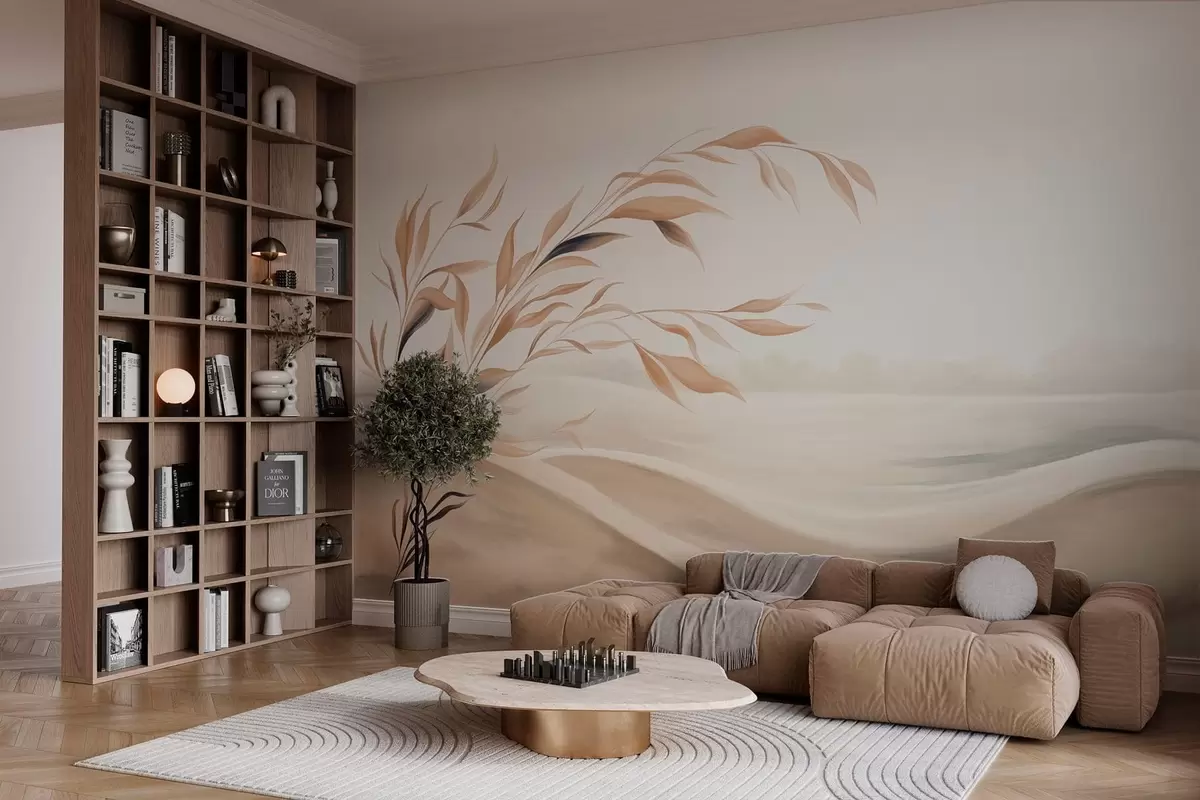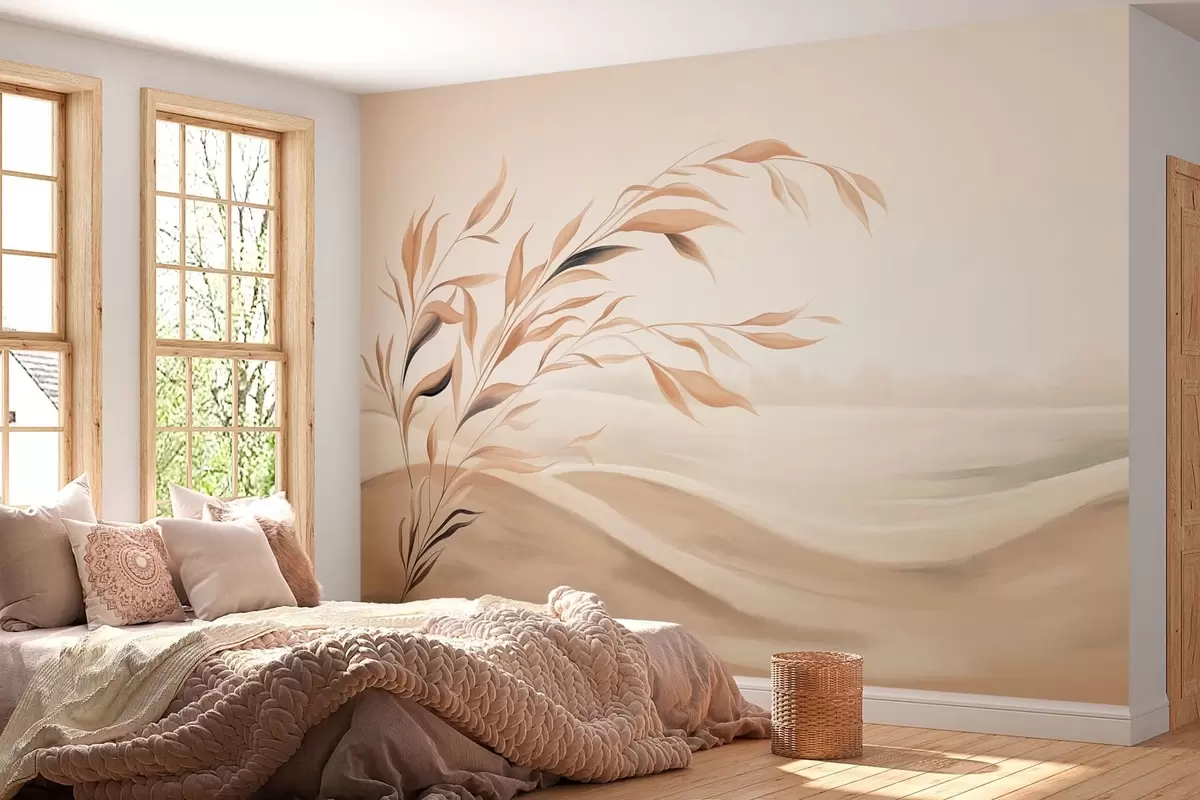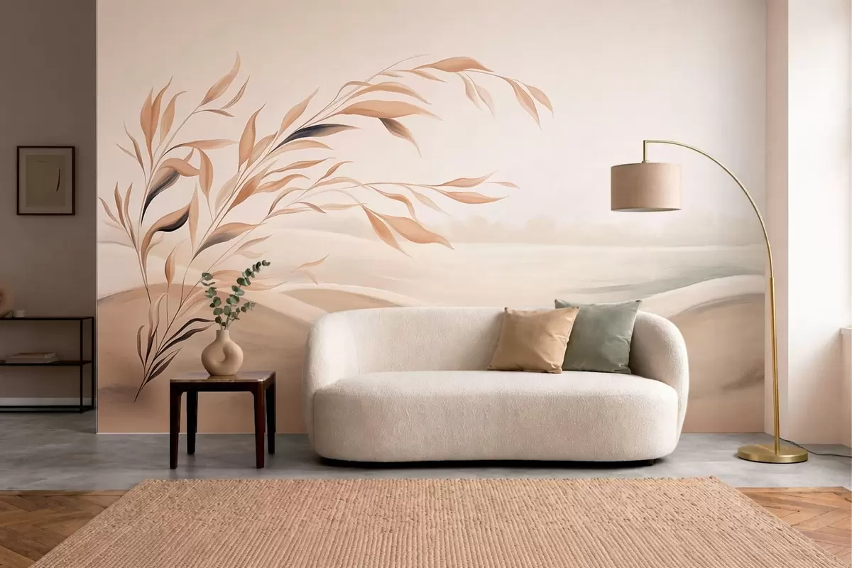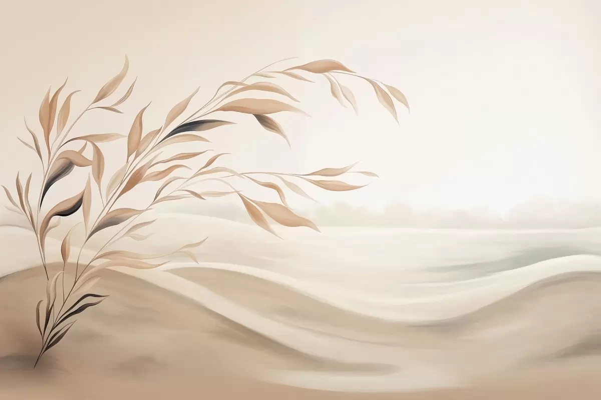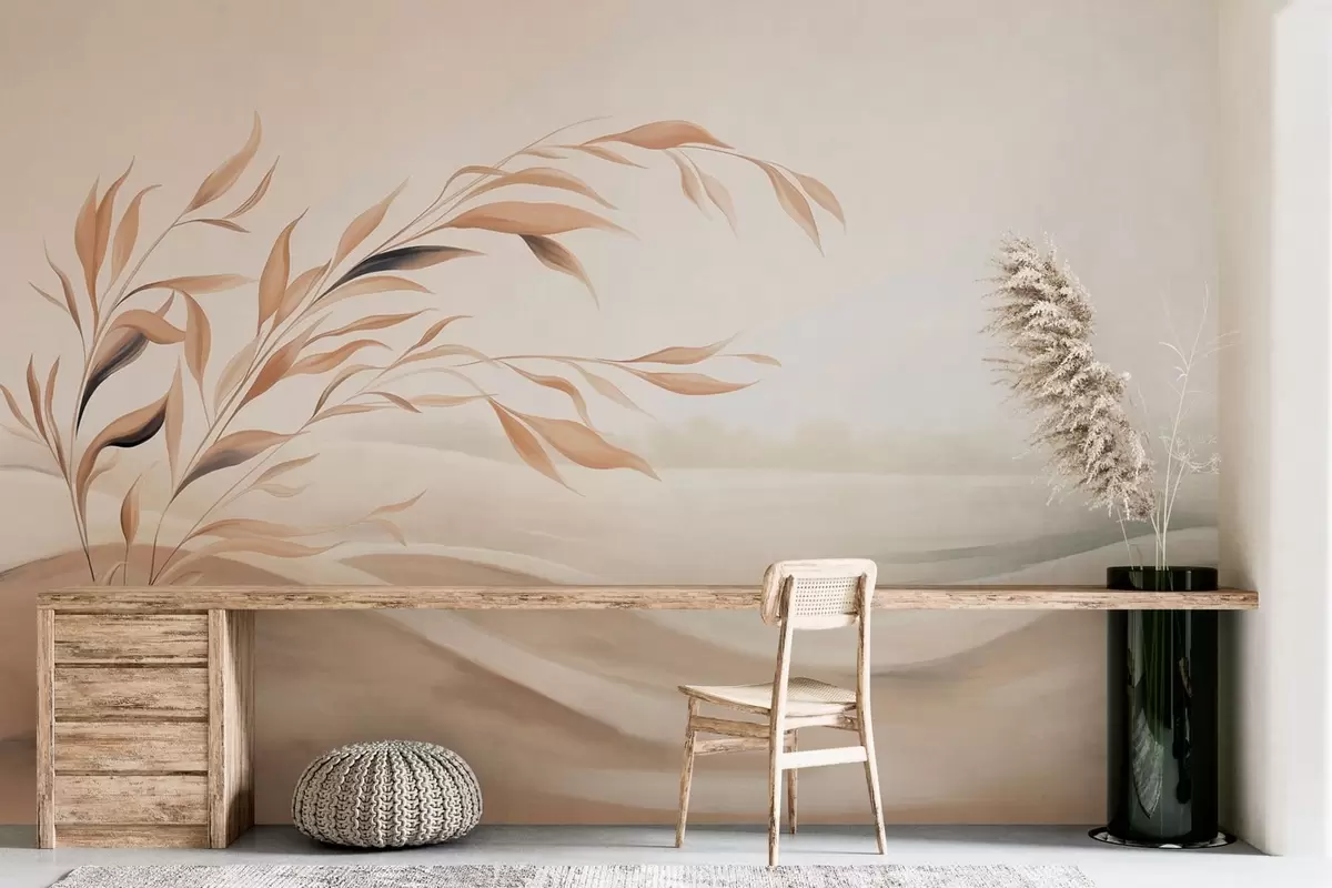Τοιχογραφίες Ένα απαλό τοπίο με ένα κλαδί πάνω από λόφους σε ανοιχτούς μπεζ τόνους Nr. w05297