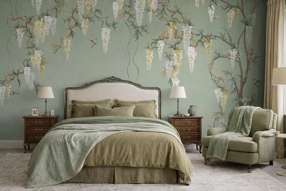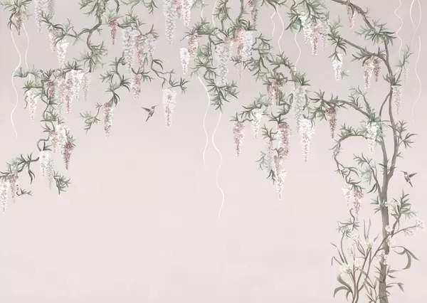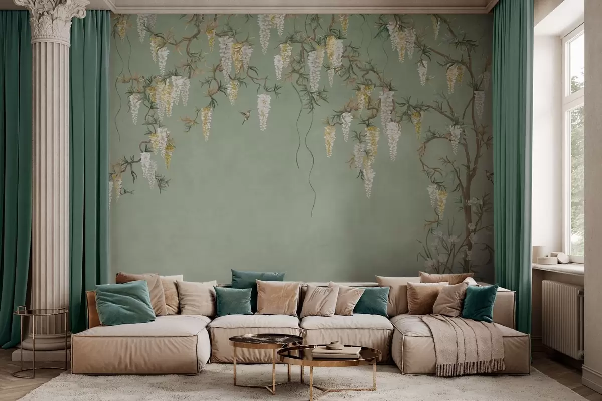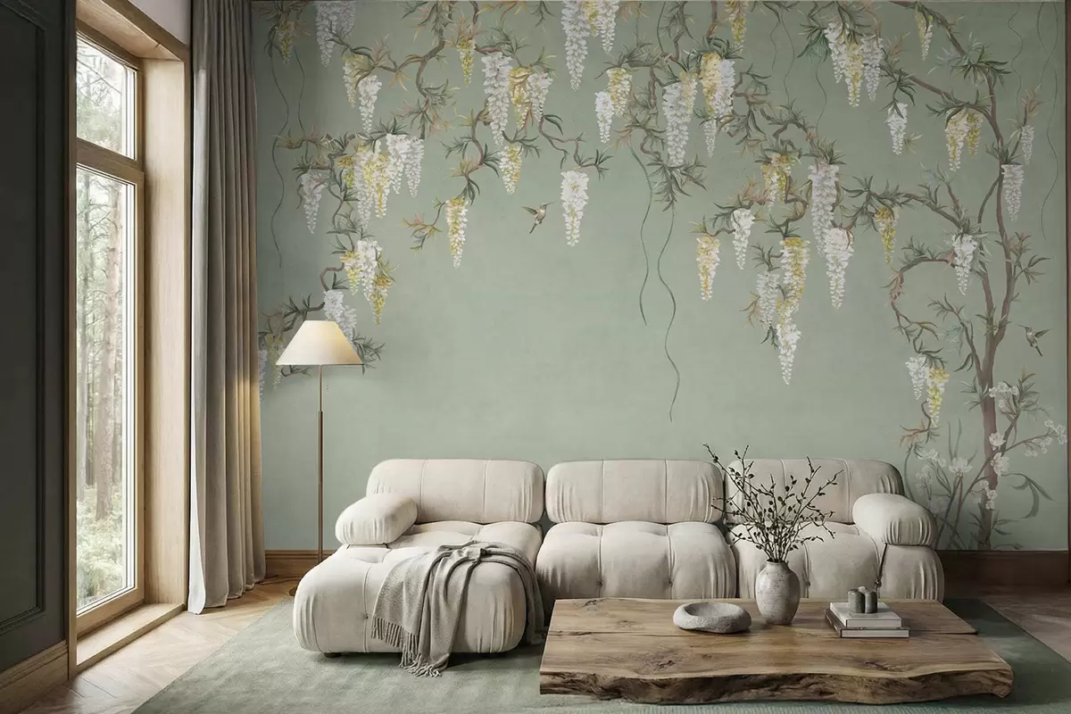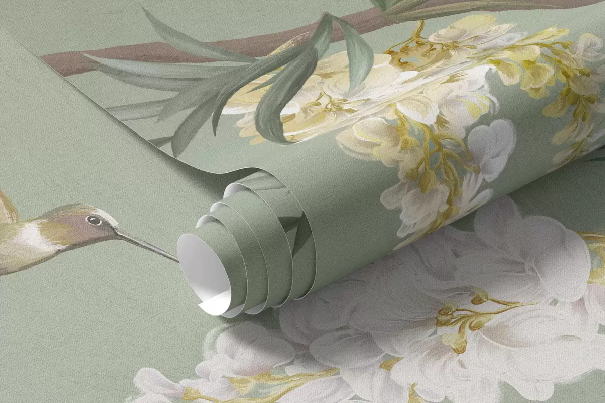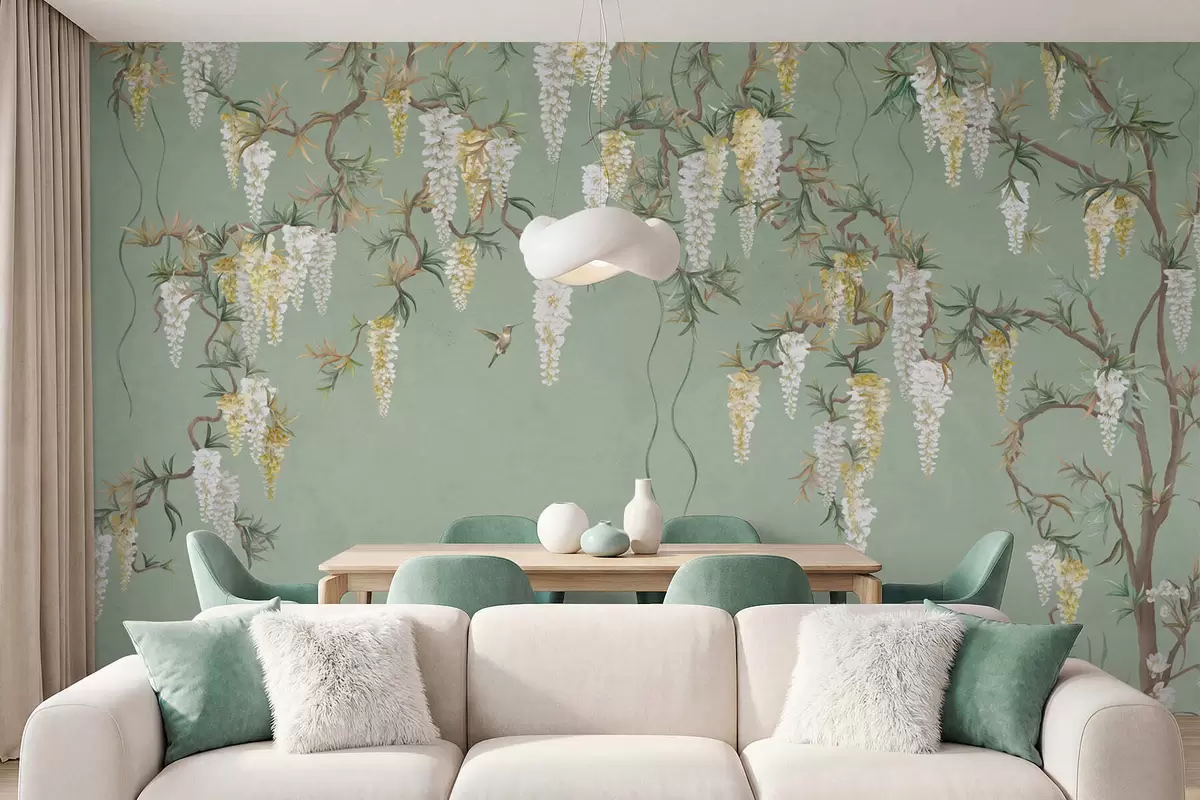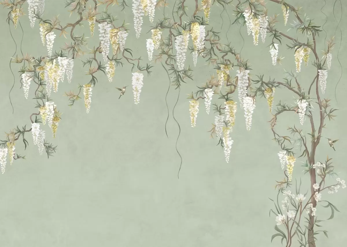 Τοιχογραφίες Ανθισμένα κλαδιά με λευκά άνθη και πουλιά πάνω σε πράσινο φόντο Nr. w05394