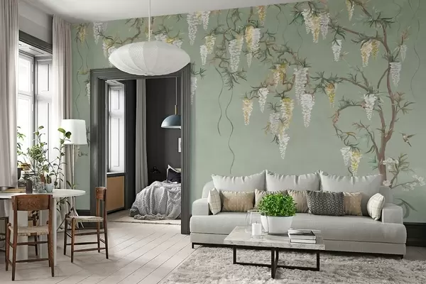 Τοιχογραφίες Ανθισμένα κλαδιά με λευκά άνθη και πουλιά πάνω σε πράσινο φόντο Nr. w05394