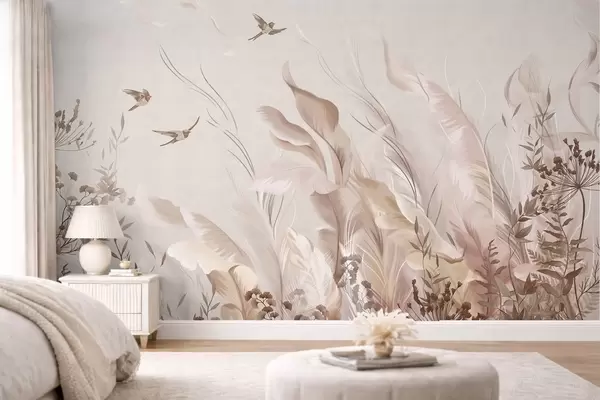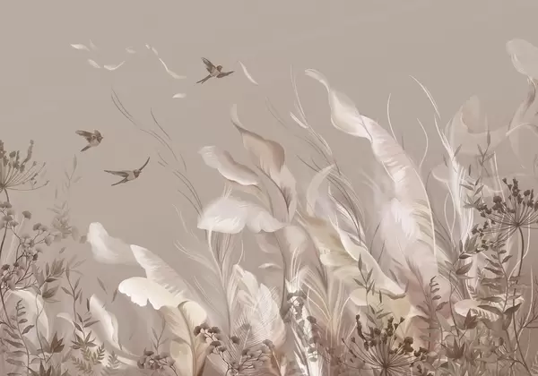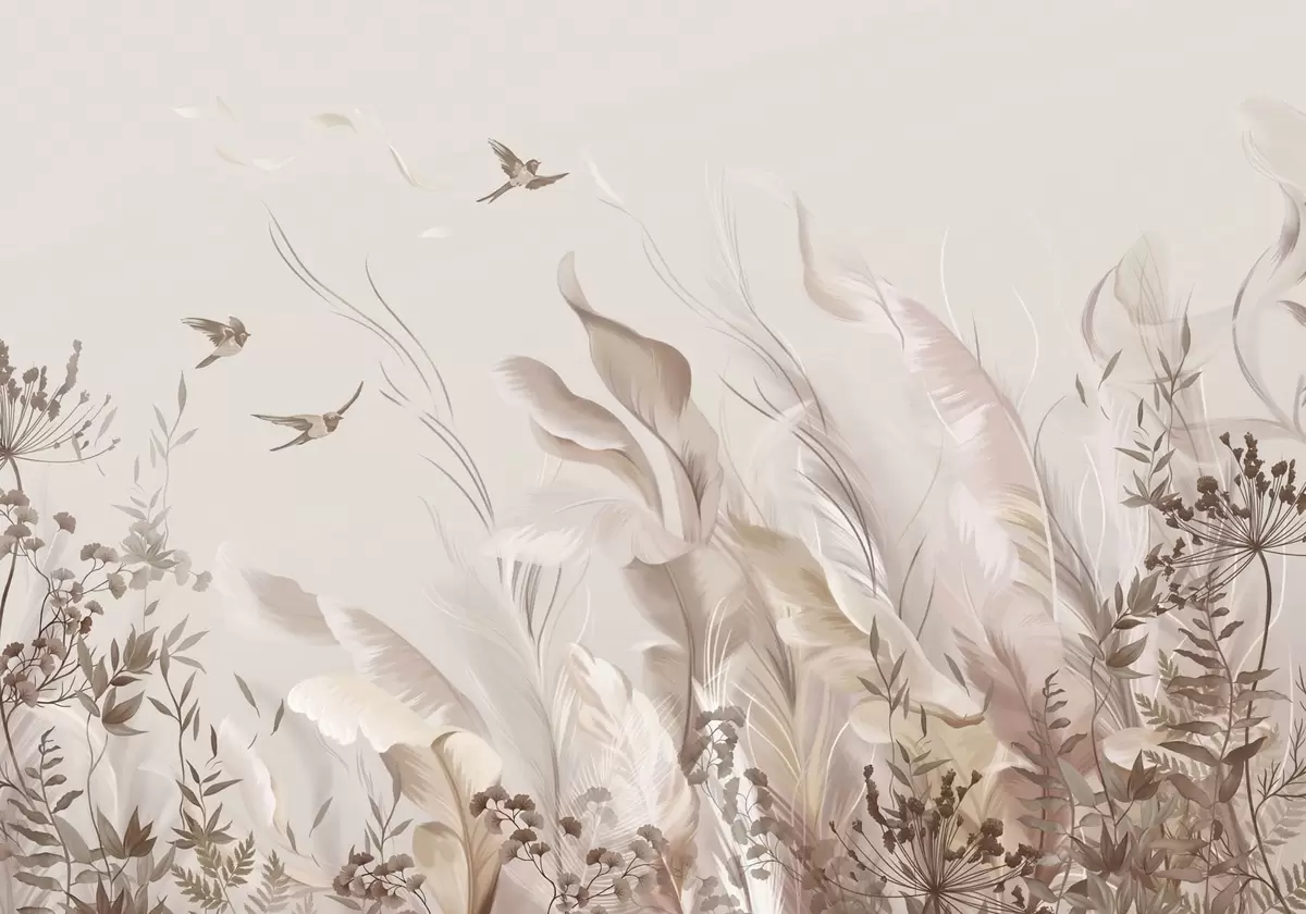 Τοιχογραφίες Απαλά φτερά, χόρτα και πουλιά σε απαλούς τόνους Nr. w05395