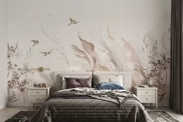 Τοιχογραφίες Απαλά φτερά, χόρτα και πουλιά σε απαλούς τόνους Nr. w05395