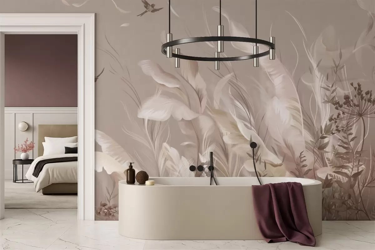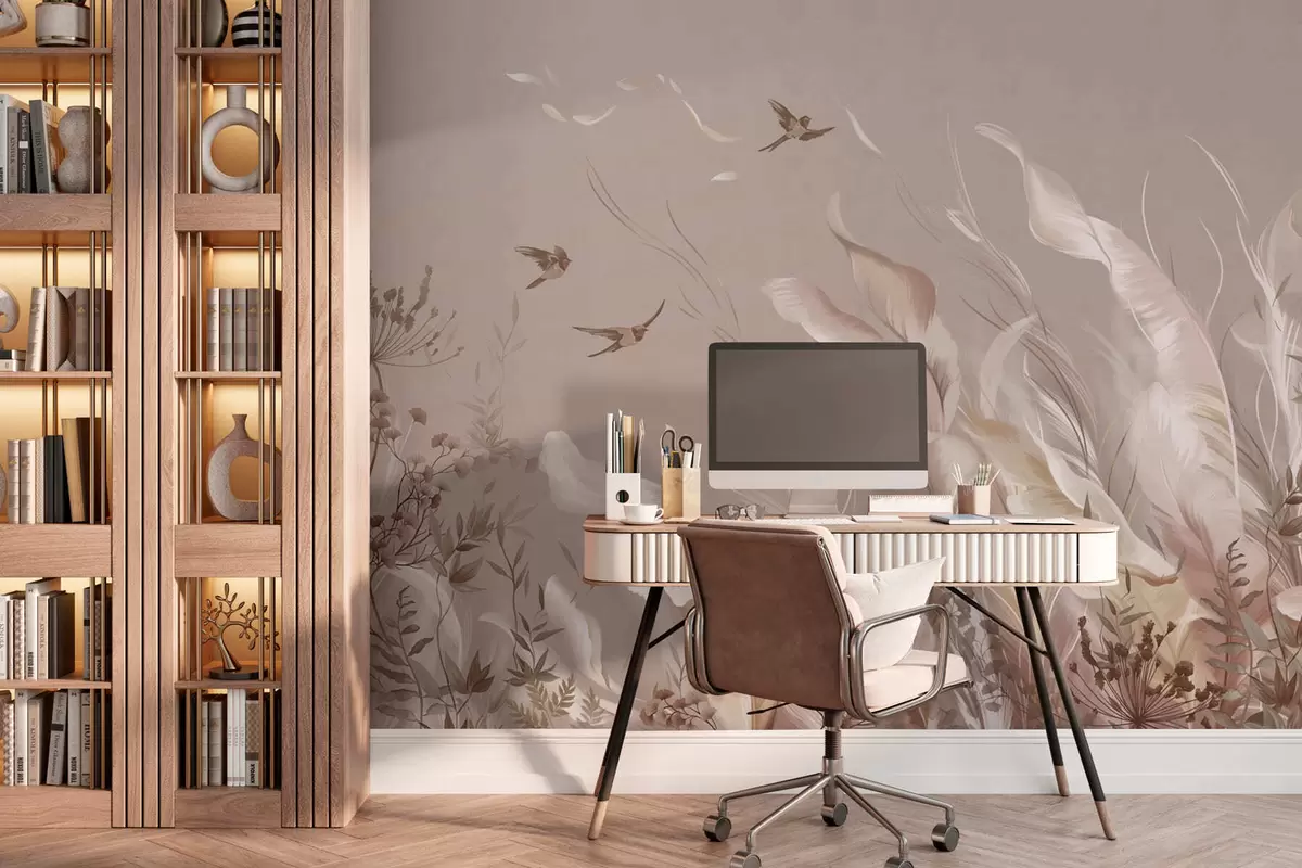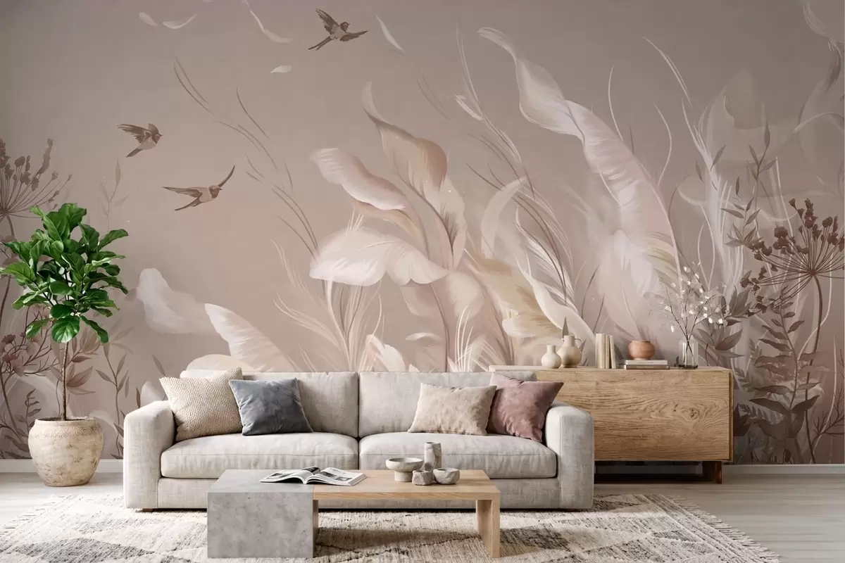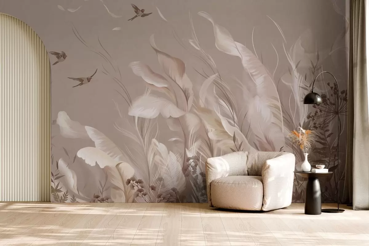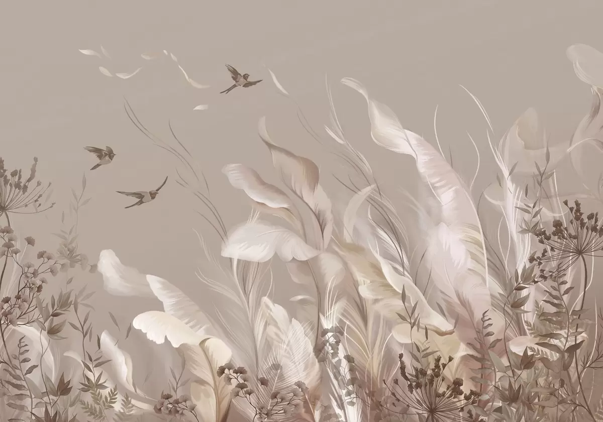 Τοιχογραφίες Ελαφριά φτερά και φυτά με πουλιά σε παστέλ αποχρώσεις Nr. w05395v1