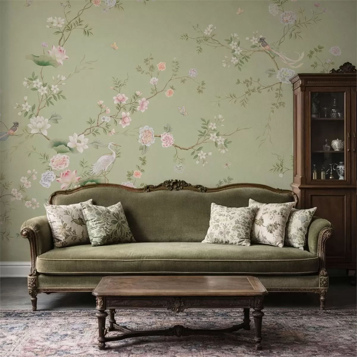Τοιχογραφίες Ανθισμένα κλαδιά με πουλιά σε ανοιχτό πράσινο φόντο Nr. w05416
