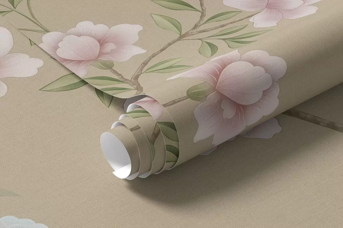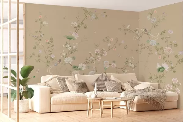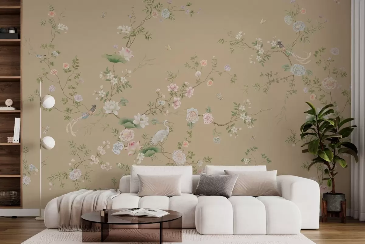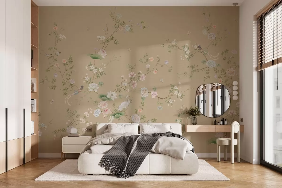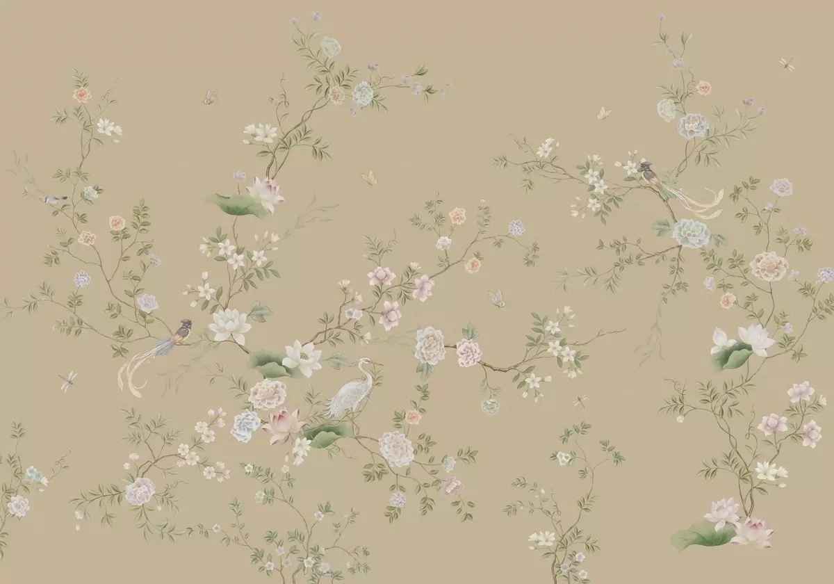 Τοιχογραφίες Ανθισμένα κλαδιά με πουλιά σε ζεστό μπεζ χρώμα Nr. w05416v2
