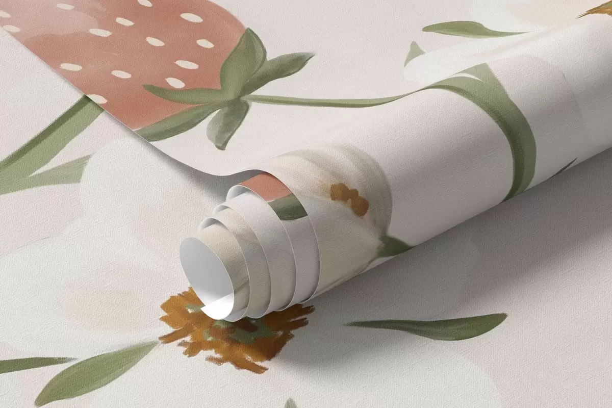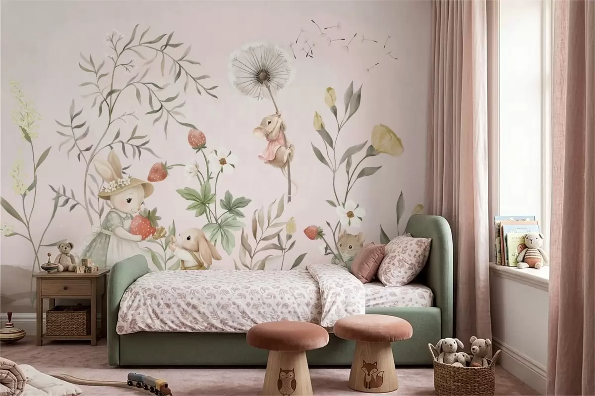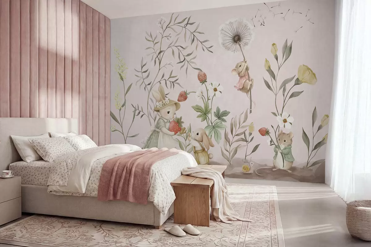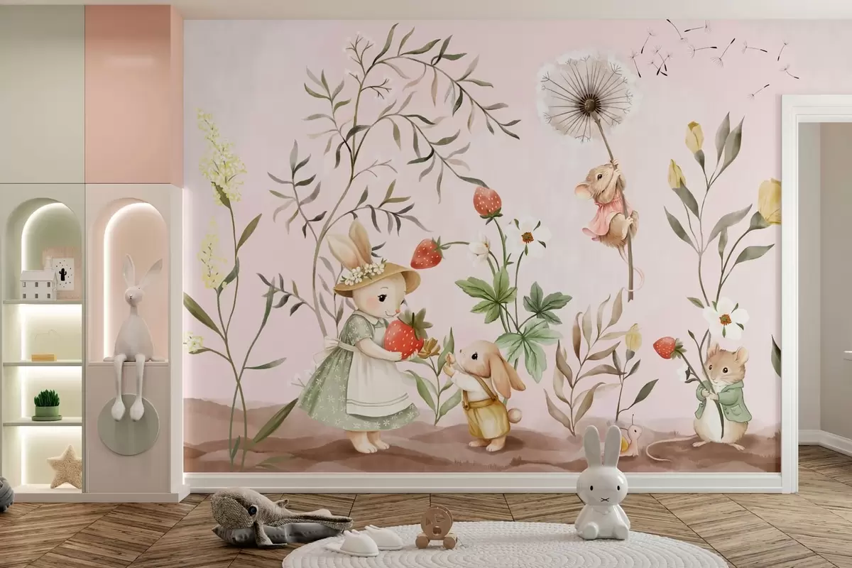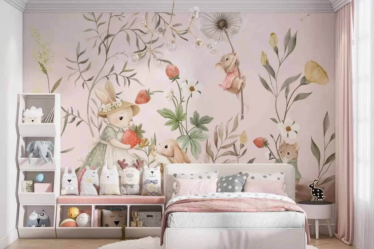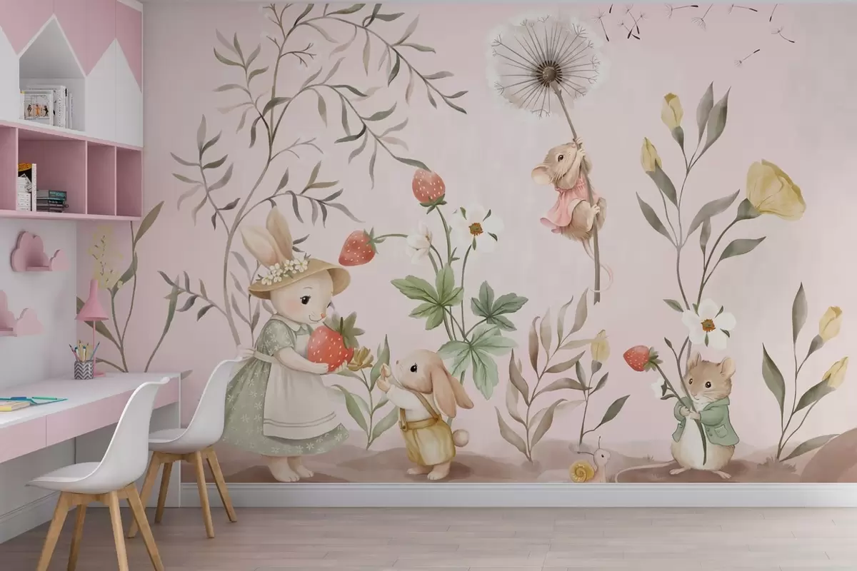 Τοιχογραφίες Εικονογράφηση ζώων με φράουλες σε απαλό ροζ φόντο Nr. w05422v1