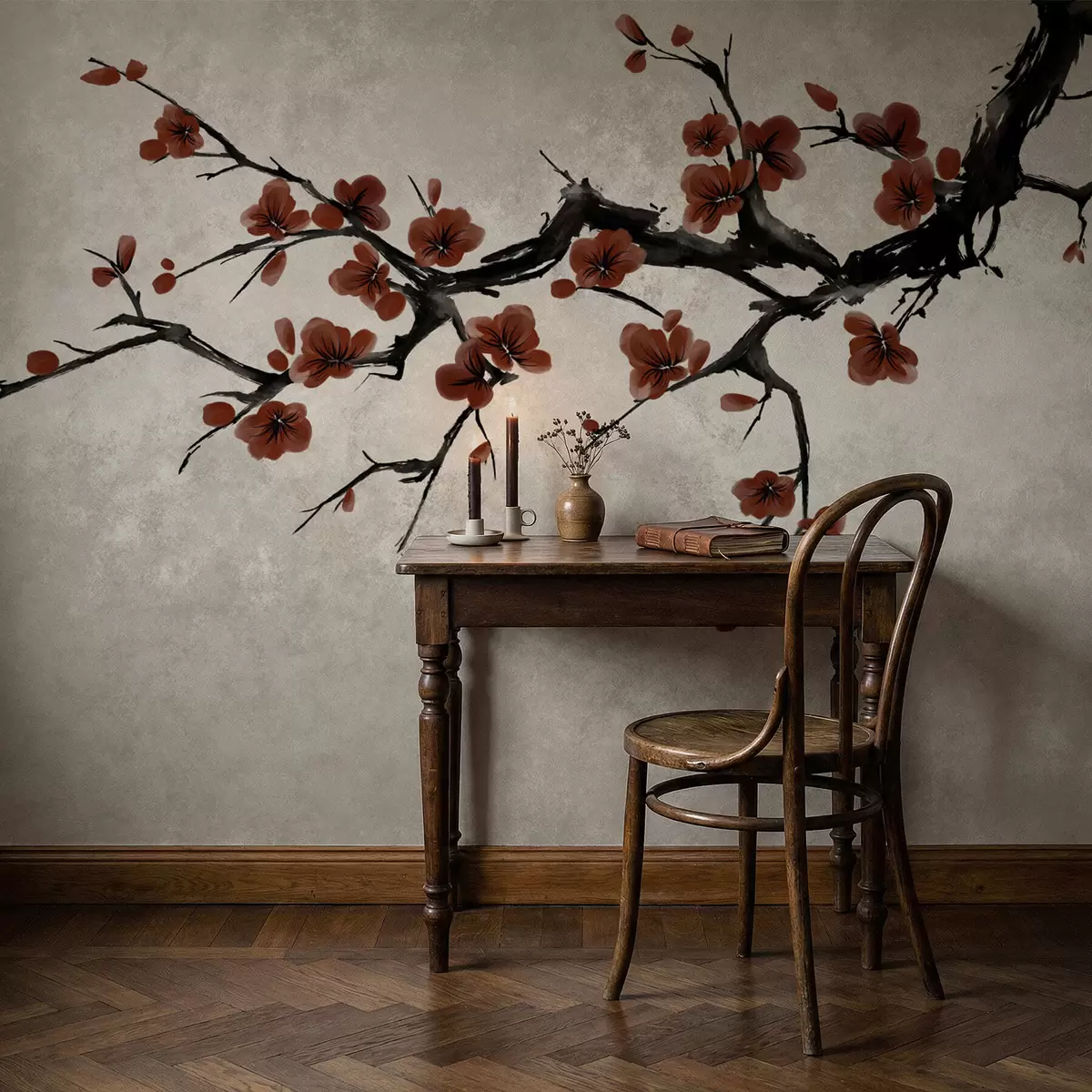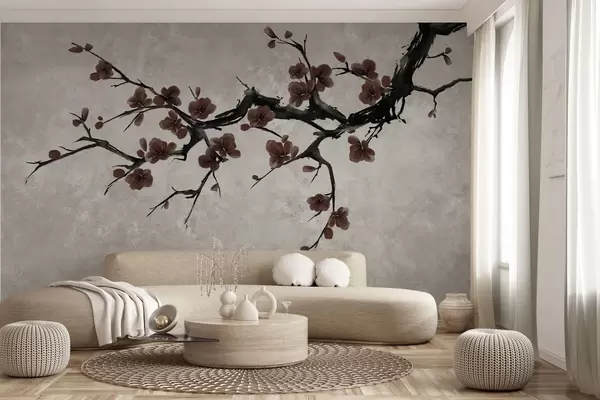 Τοιχογραφίες Κλαδί με σκούρα κόκκινα άνθη σε ουδέτερο φόντο Nr. w05425v1