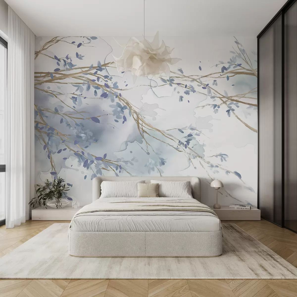 Τοιχογραφίες Λεπτά μπλε και λευκά λουλουδάτα κλαδιά με απαλό, θολό φόντο ακουαρέλας Nr. w07919