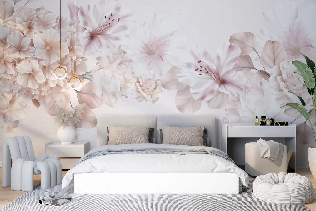 Τοιχογραφίες Απαλή ροζ και λευκή σύνθεση λουλουδιών, με λεπτά πέταλα και άνθη σε ανοιχτόχρωμο φόντο Nr. w07923