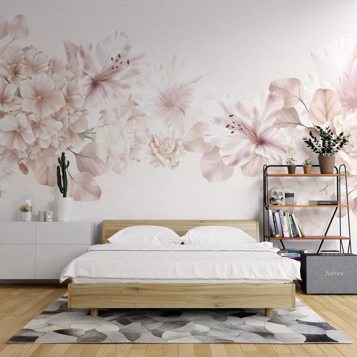 Τοιχογραφίες Απαλή ροζ και λευκή σύνθεση λουλουδιών, με λεπτά πέταλα και άνθη σε ανοιχτόχρωμο φόντο Nr. w07923