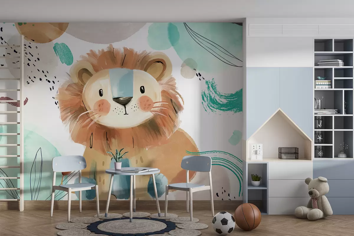 Τοιχογραφίες Ένα χαριτωμένο λιοντάρι κινουμένων σχεδίων σε πολύχρωμο, αφηρημένο φόντο με πινελιές και πιτσιλιές παστέλ χρωμάτων Nr. w07924