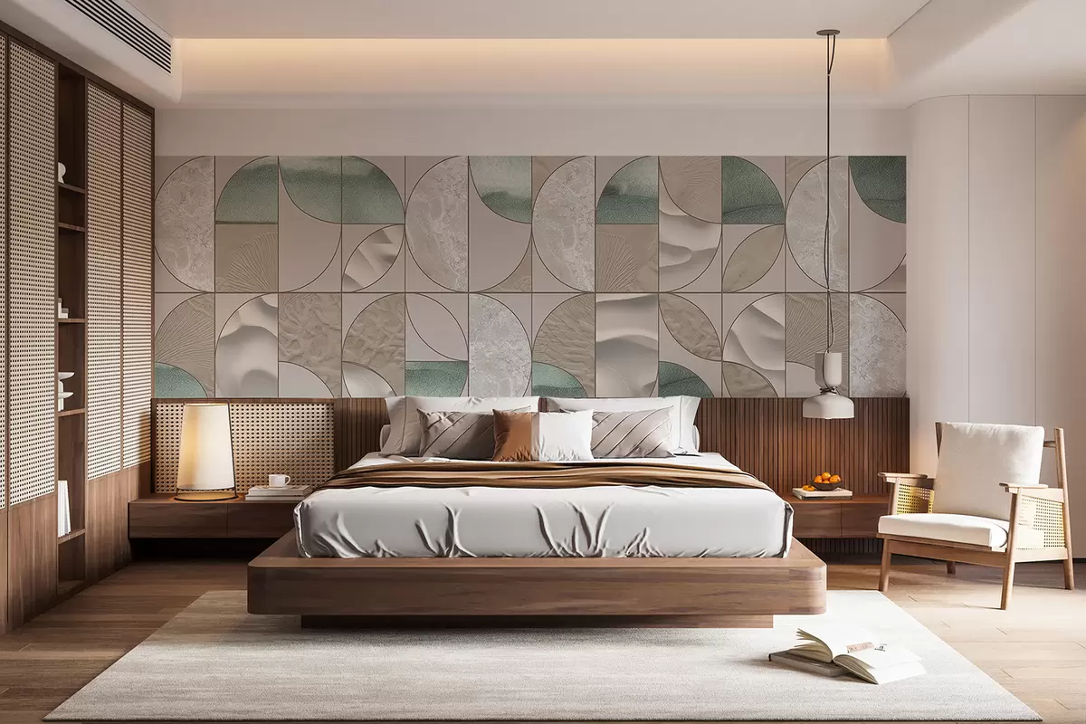 Τοιχογραφίες Ένα γεωμετρικό σχέδιο από πράσινες, μπεζ και λευκές υφές διατεταγμένες σε επαναλαμβανόμενο αφηρημένο σχέδιο Nr. w07928