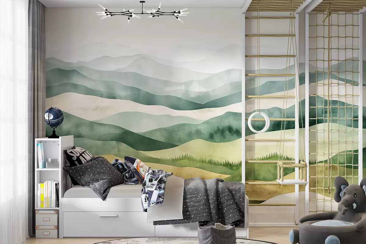 Τοιχογραφίες Ακουαρέλα βουνά τοπία, δάσος, φυσικά πράσινα και μπεζ χρώματα Nr. w07950
