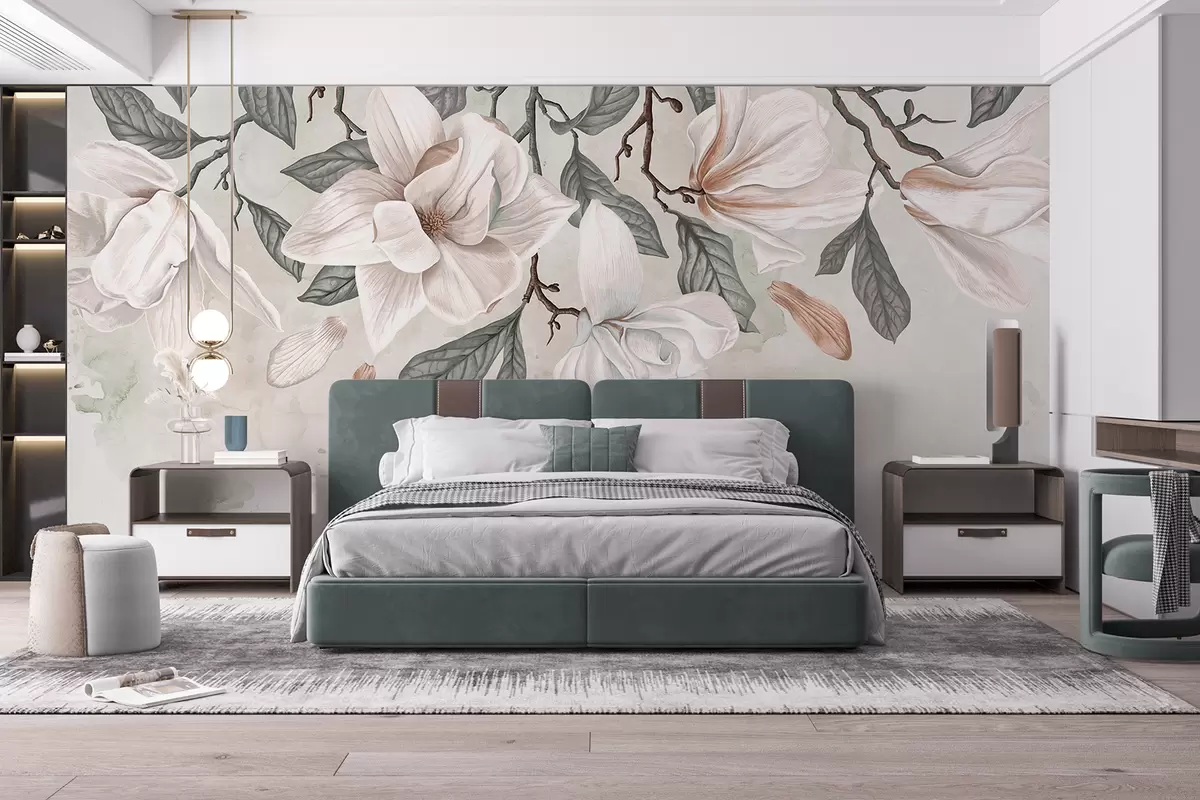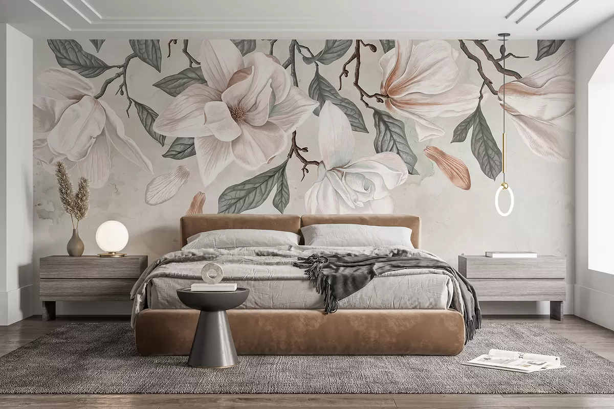 Τοιχογραφίες Λεπτά ροζ και λευκά άνθη μανόλιας με πράσινα φύλλα σε ανοιχτόχρωμο φόντο, μια απαλή, λουλουδάτη σύνθεση Nr. w07977