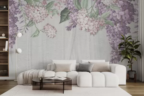 Τοιχογραφίες Ένα λουλουδάτο στάμπα με λευκά και μοβ λουλούδια, πασχαλιές με πράσινα φύλλα σε ανοιχτόχρωμο υφασμάτινο φόντο Nr. w07984